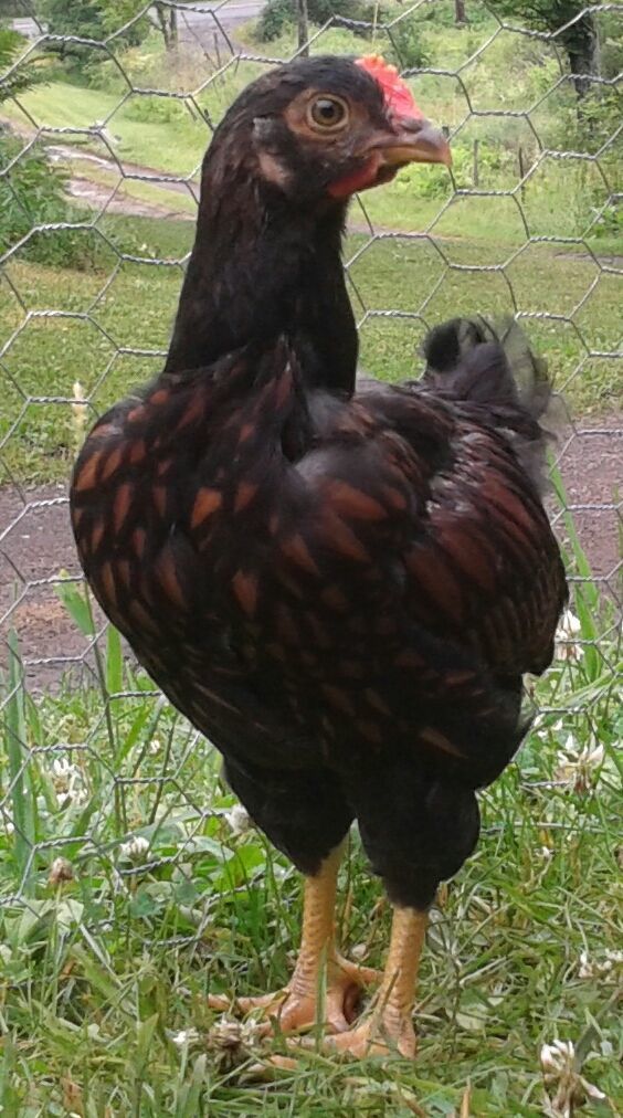 I was leaning partridge plymouth rock as a chick, but now that it's feathering out not sure. Seems pretty stocky, and I don't think lacing is right, and if it's a cockerel they don't have lacing on the feathers. Looks kinda black sexlinkish now, but not as a chick. I'd almost say possible dark cornish cause of it's stocky width but they don't have straight combs so can't be.... IDK?...