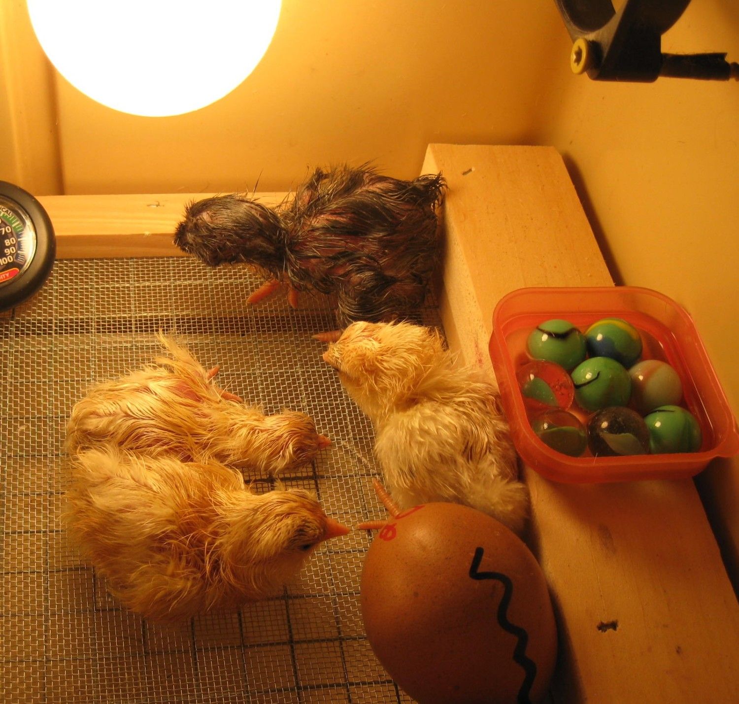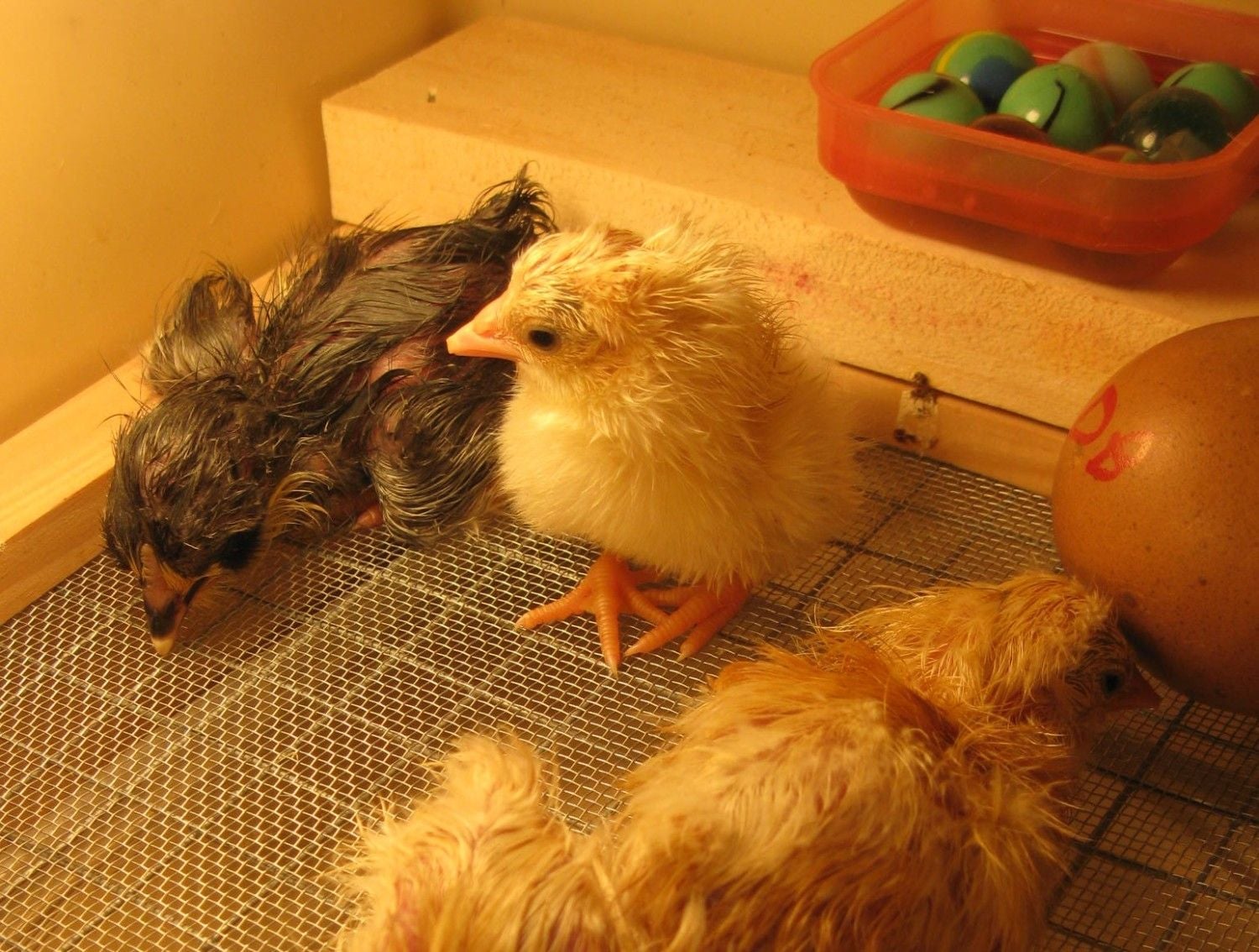 Harmony (my 8 yr old) Hatched 4 cute yellow SERAMA peeps from CPL the yellows will go good with Bheps black serama she just hatched last week! (fourth is on the other side of the bator)