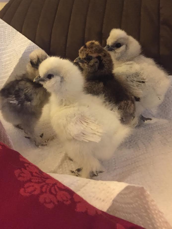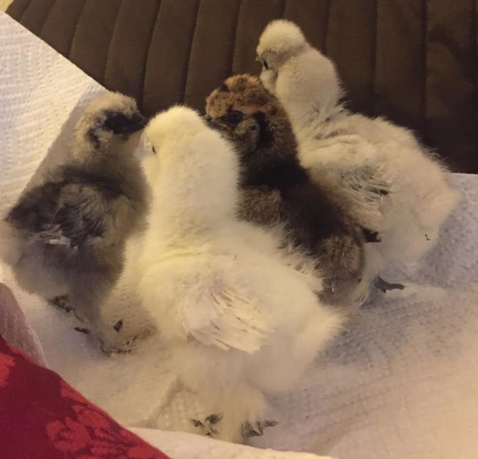 The October hatchlings at one week old: four cute silkies of indeterminate color. I love the look of the silvery-blue one with the black accents! The silvery-white chick now has some black feathering in the wings. Silkies are full of surprises! Good luck with your hatches, all.