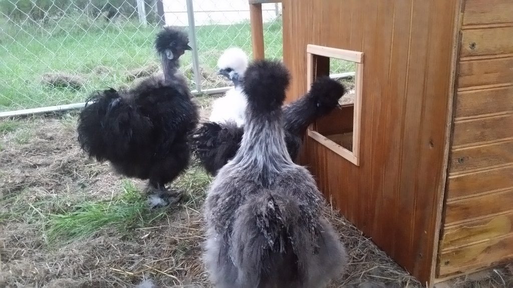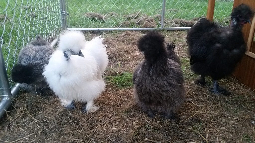 Here's my pretty girls and boy. :-) I don't know what the silvery color is actually called. I think they are around 6 months. Kids named her Silver Nugget because she was ultra tiny as a chick. Left to right: Silver Nugget, Adore, Silver, and Jujubee the rooster Jujubee and Adore This hen is Silver. Yeah, the kids were creative with the silkie names. :P I thought it was funny she was looking in the window.