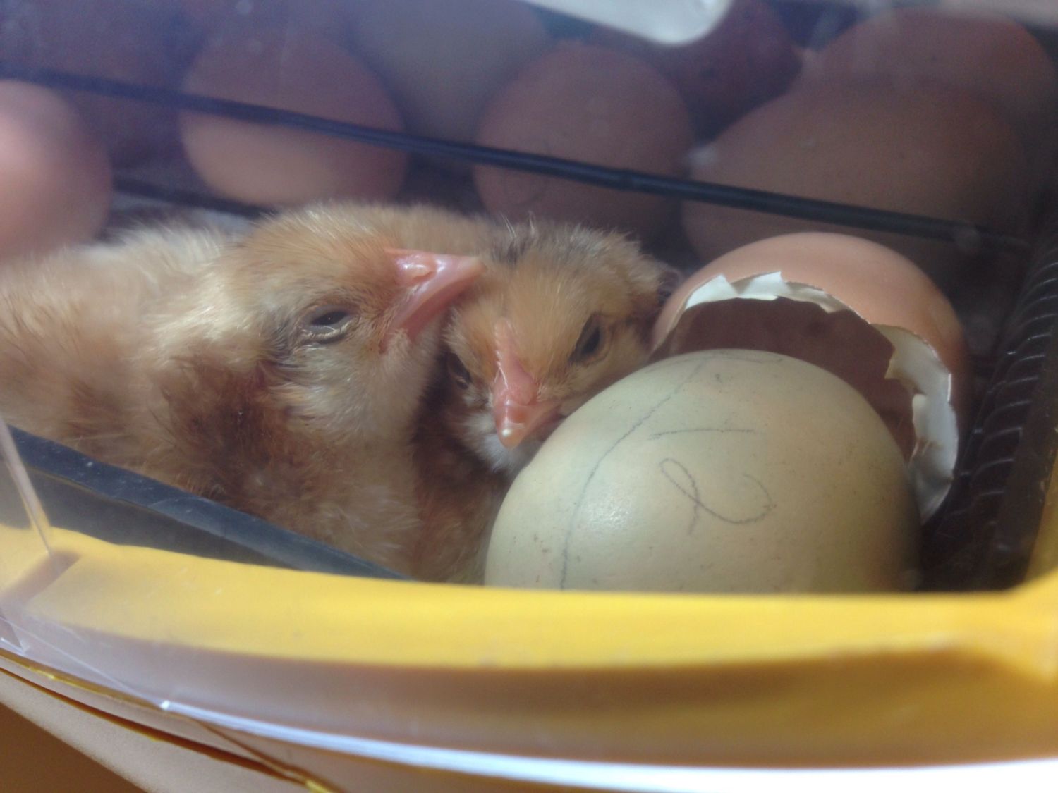 26 of my 28 have hatched! I candled the other two this morning and there is still movement in one! Maybe it's just a late bloomer. I'm so excited!