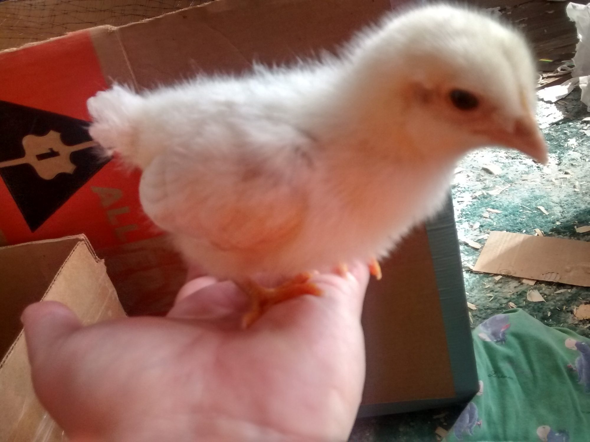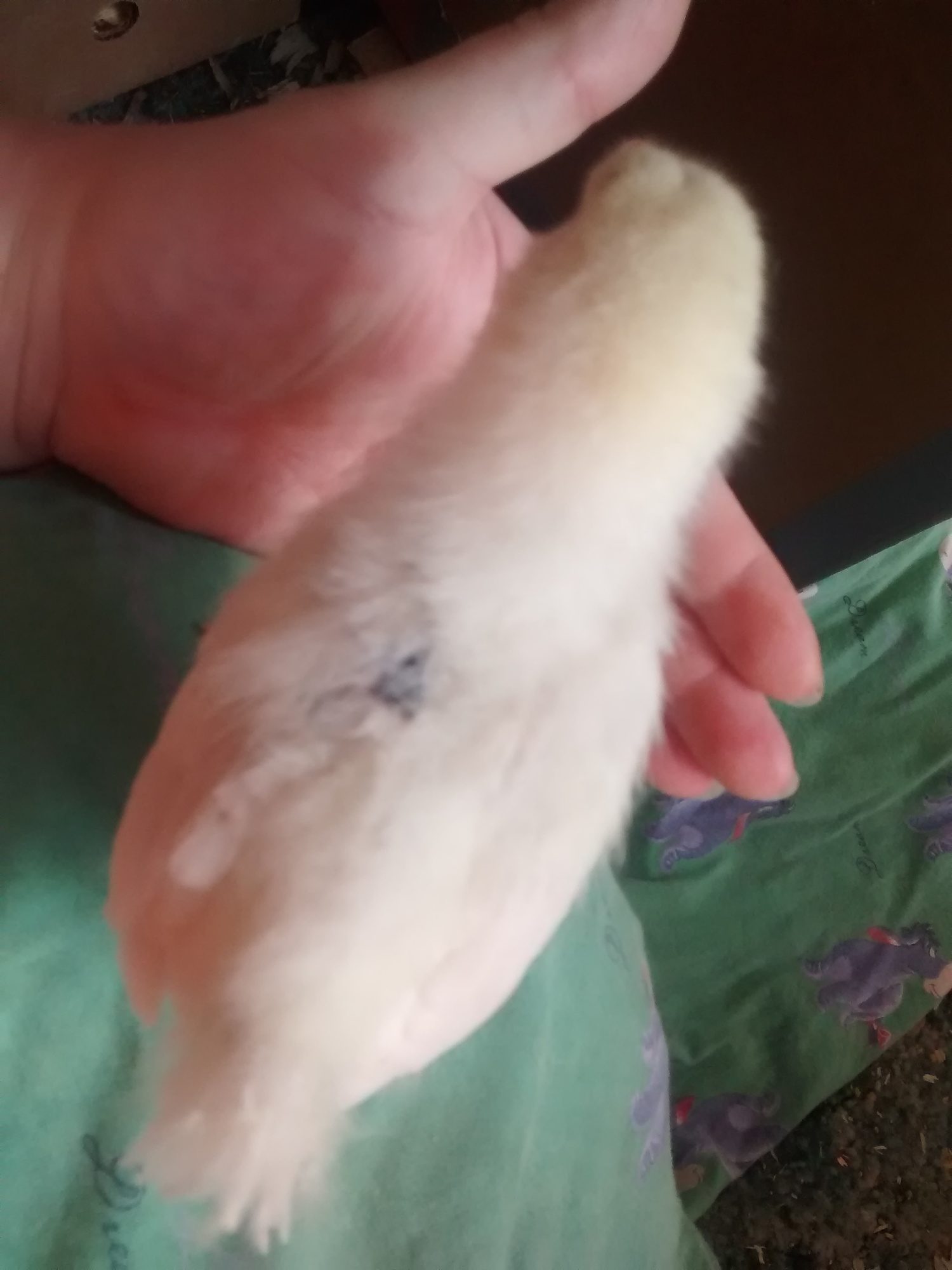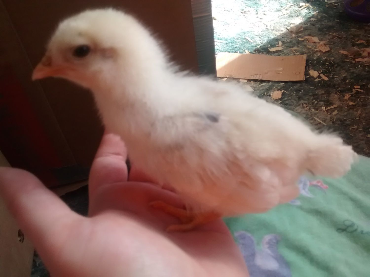 The next three are the white chick. In the first picture you can see a small black speck of down above her left eye as well as a half black tail feather coming in. In the second picture you can see the black feather that has come in on her back/shoulder region. She(hopefully) also has a few other black specks in her down though quite small they seem to be growing every few days.