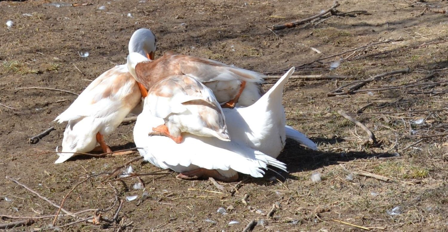 All 3 Buff/White drakes trying to mate with my goose Angelica, since her gander was killed by a coyote she's a duck-lover so it makes her very happy. The Lavender drake that mated with the Call isn't interested in geese, he's a purist evidently as opposed to these guys who don't care WHAT they mate with...lmao