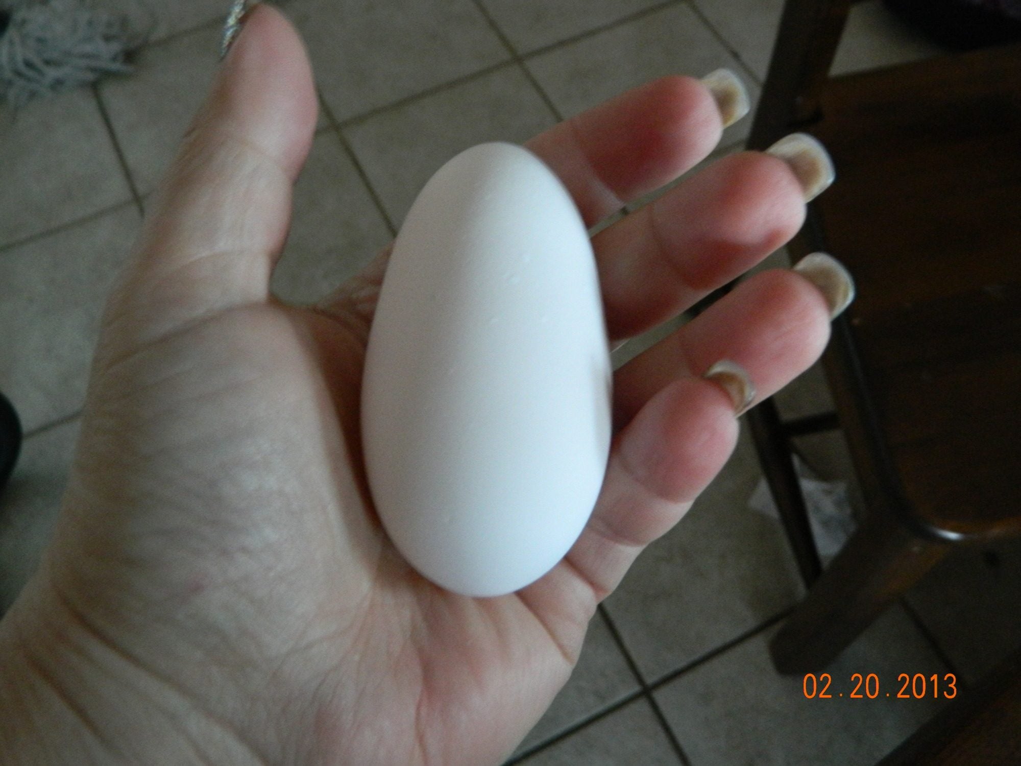 we have a white chicken (sorry don't know the breed) that was laying nice white eggs from the time we adopted her until she stopped 10/15 due to molting..... well today she finally laid one but it was very long and narrow so long it wouldn't even fit in the egg carton