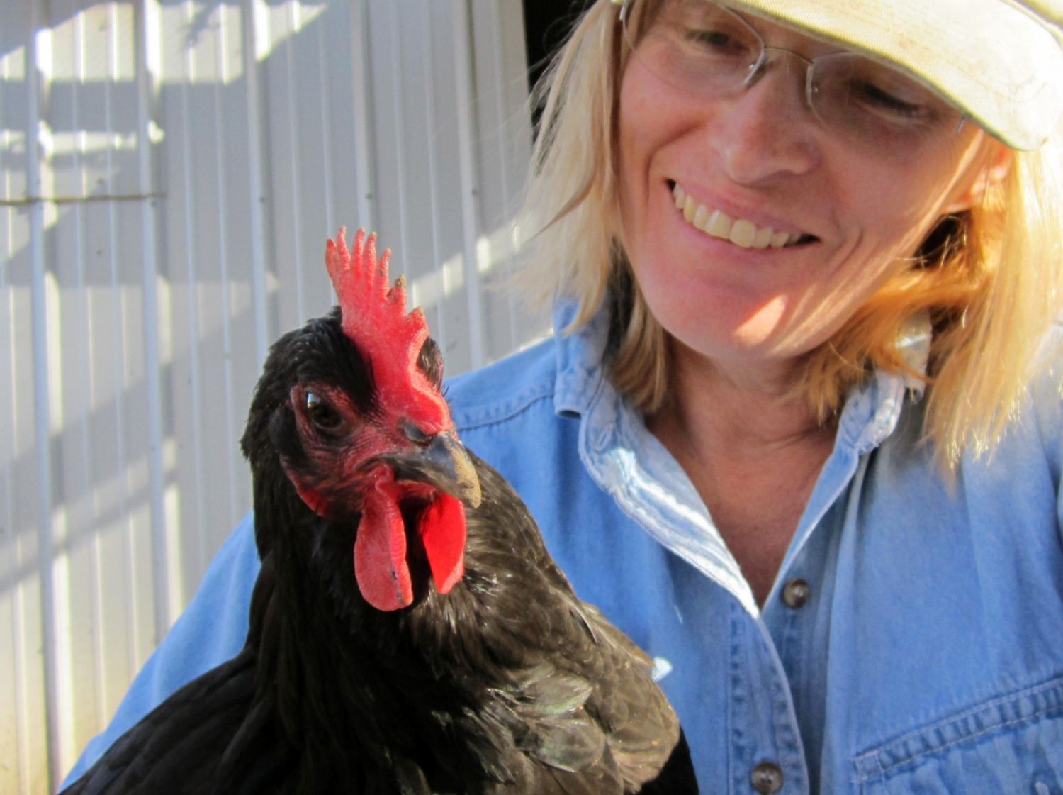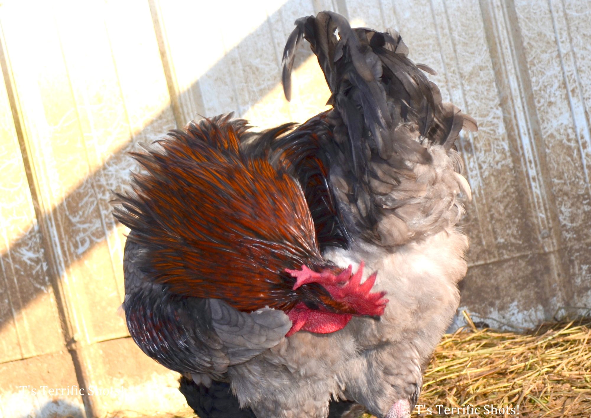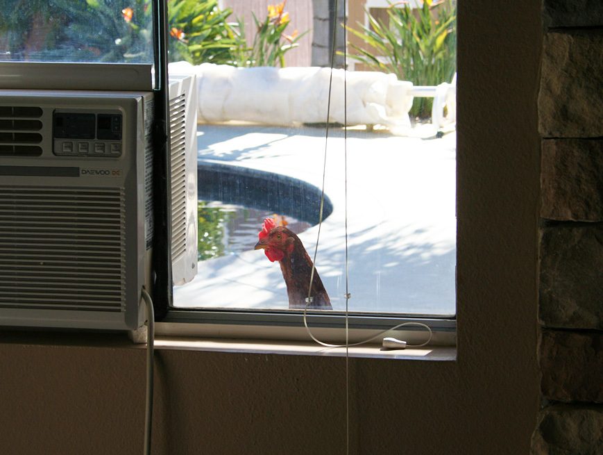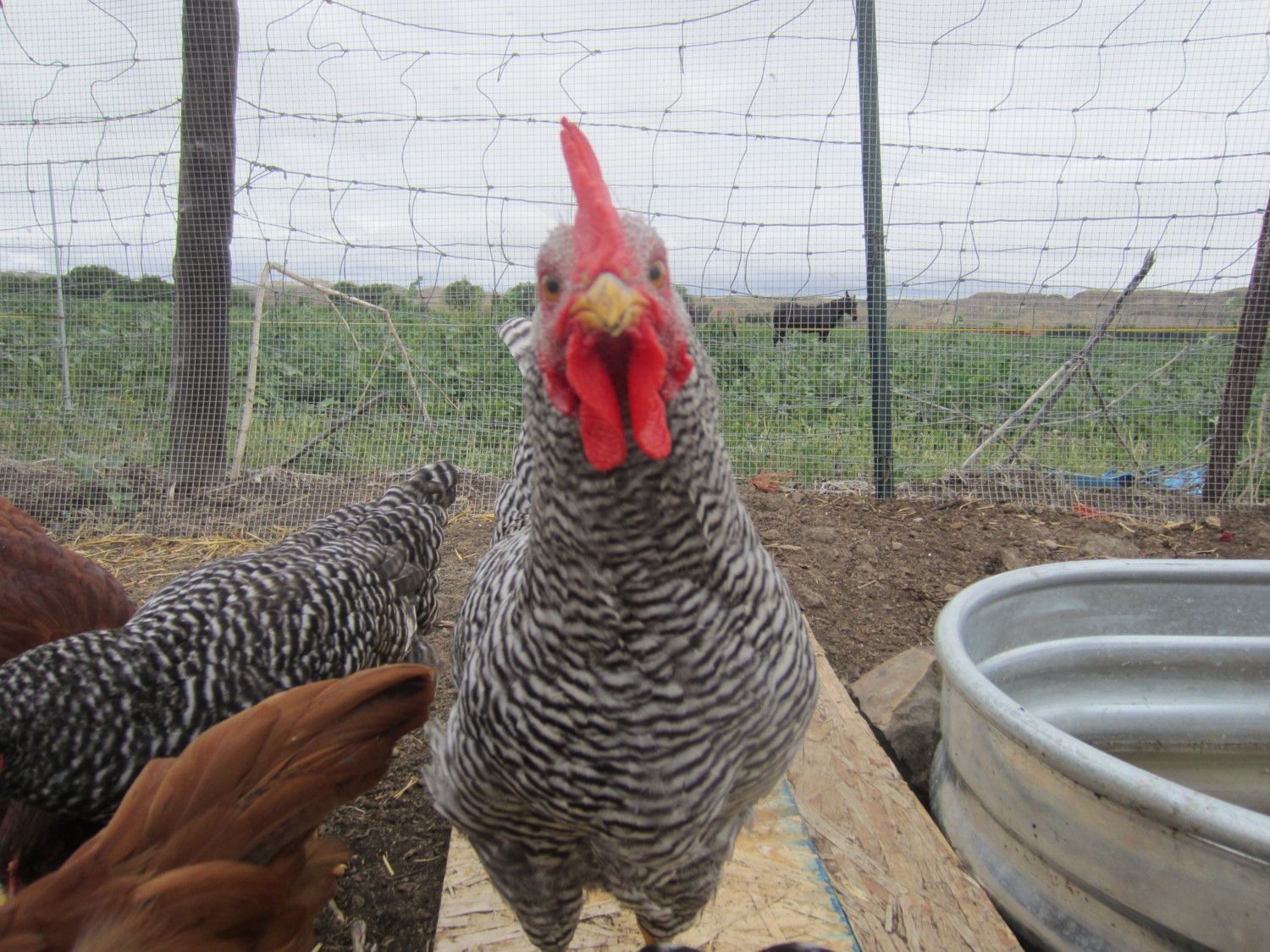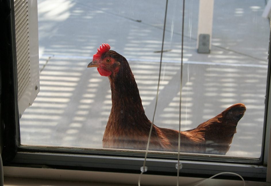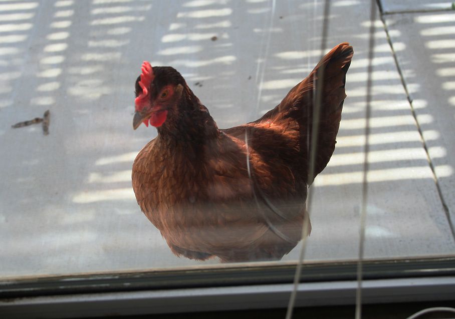 That is Eddy the rooster and i think he is thinking or saying ''I can see the whole world from up here''
