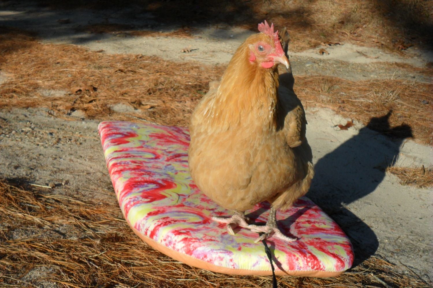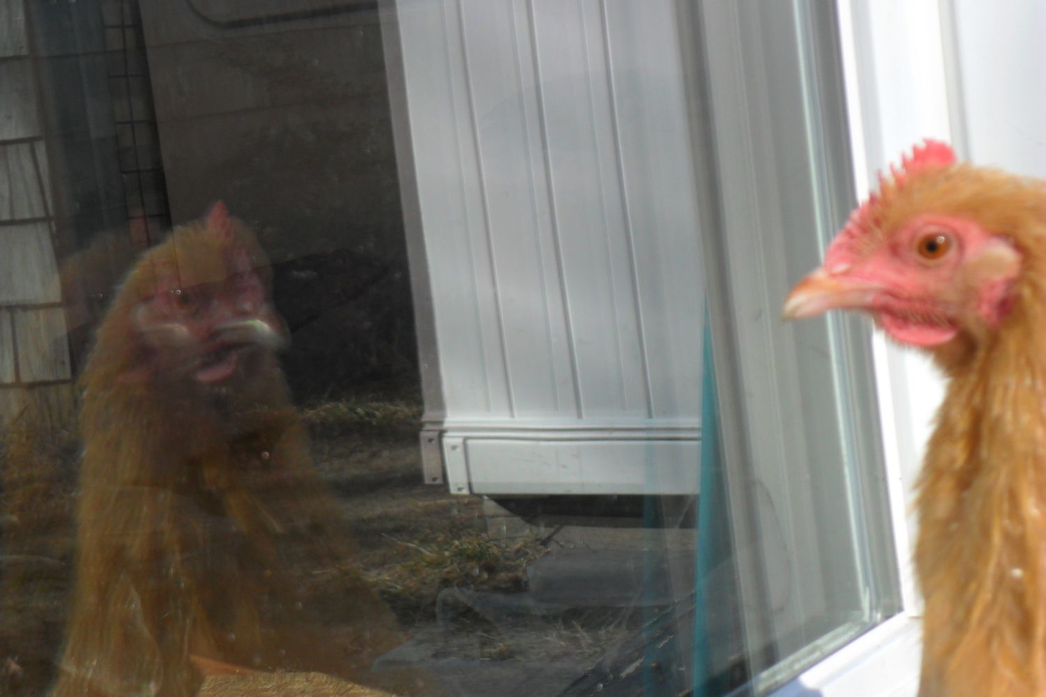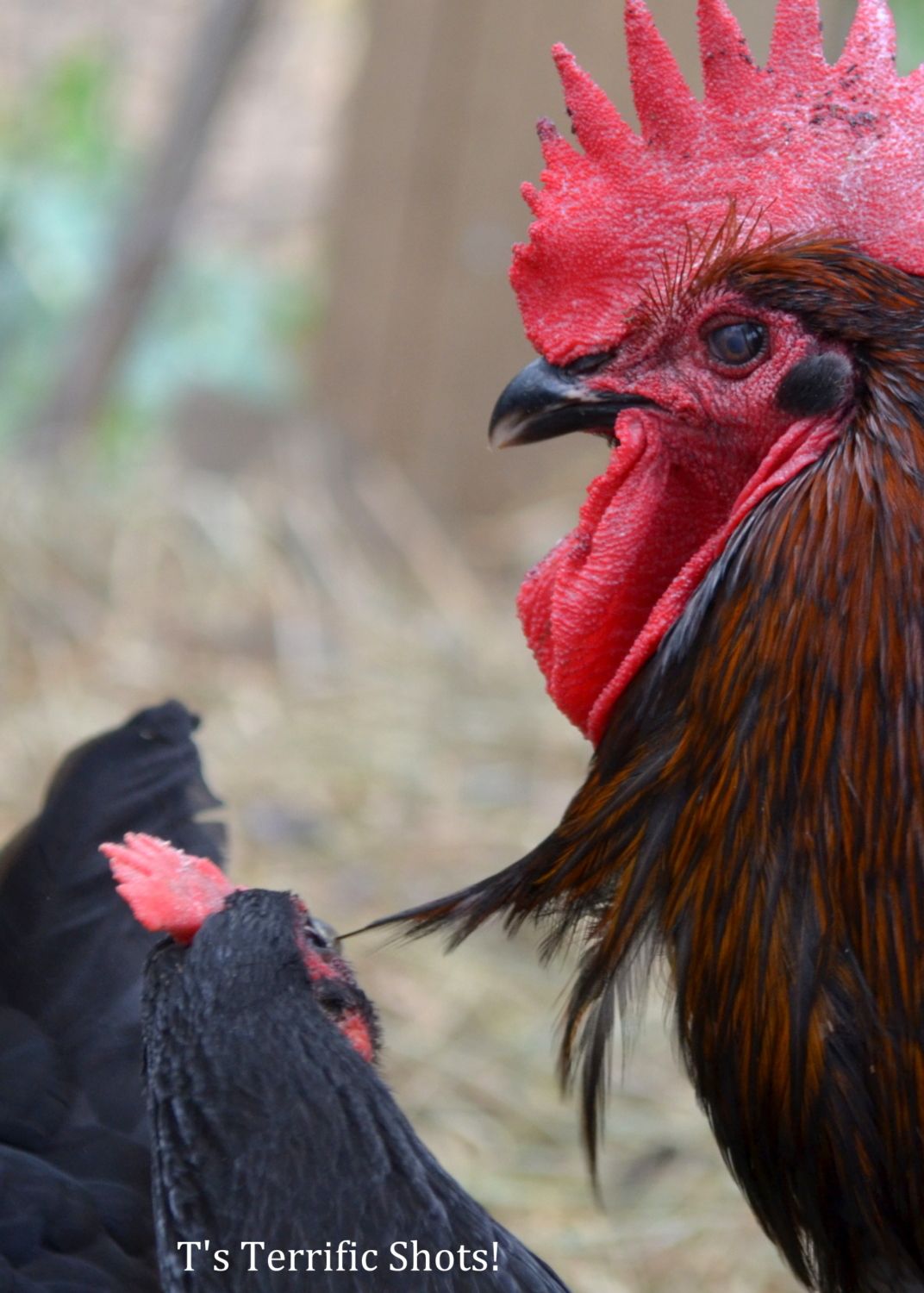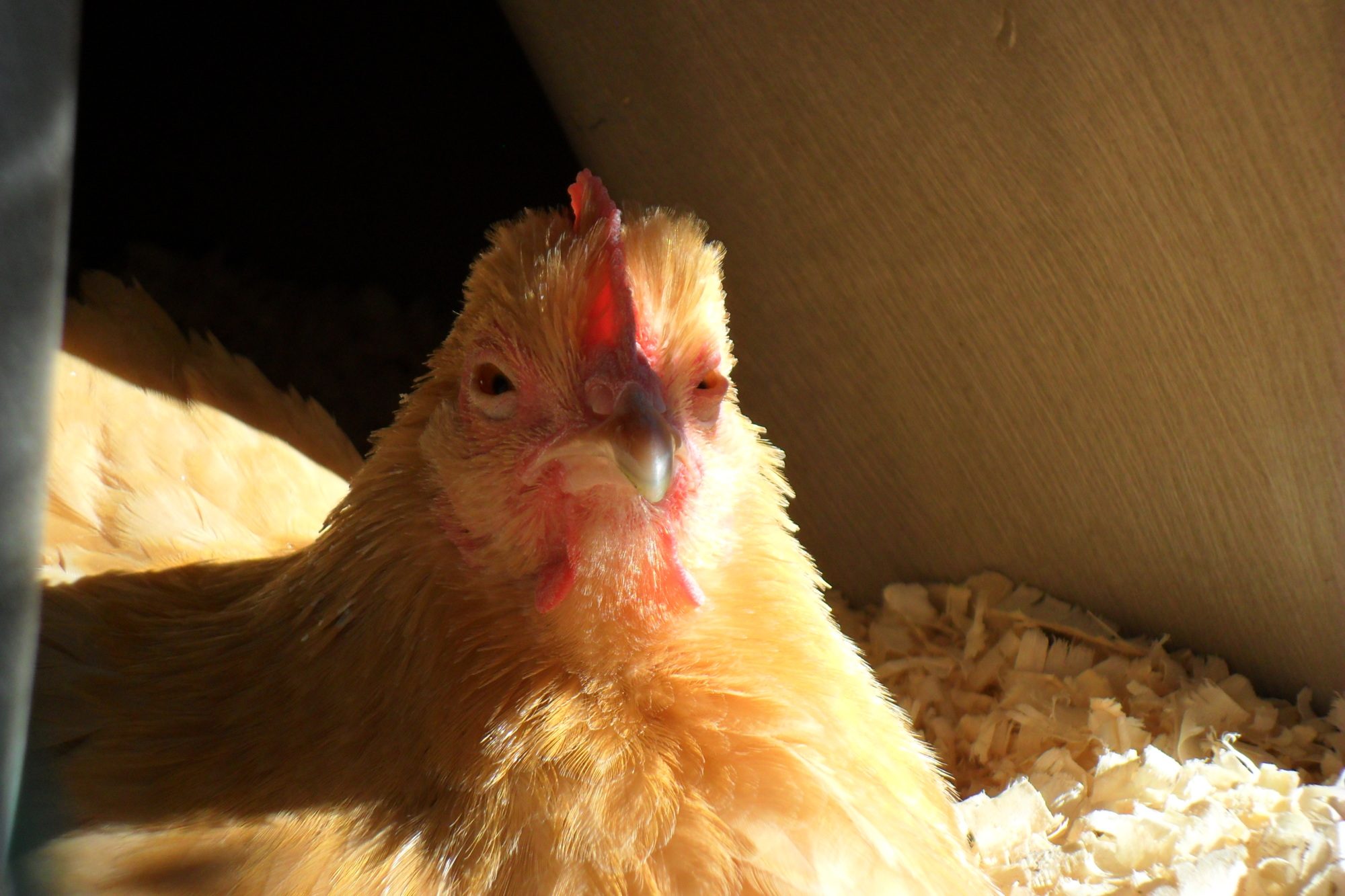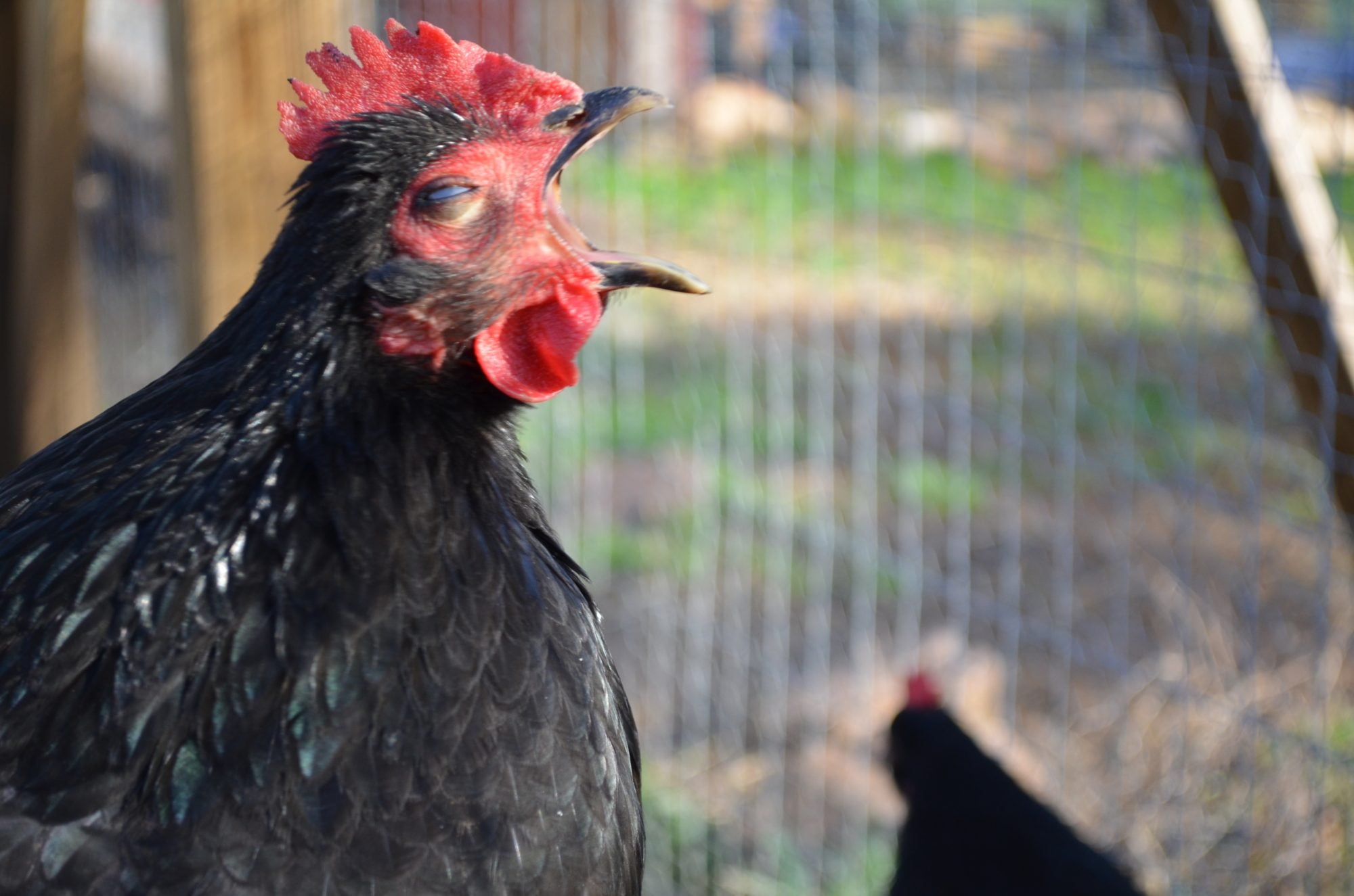 That is Eddy the rooster and i think he is thinking or saying ''I can see the whole world from up here''