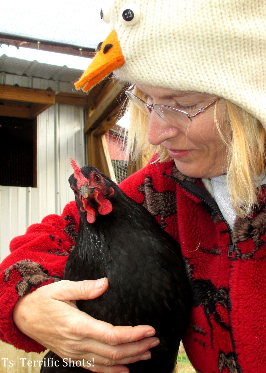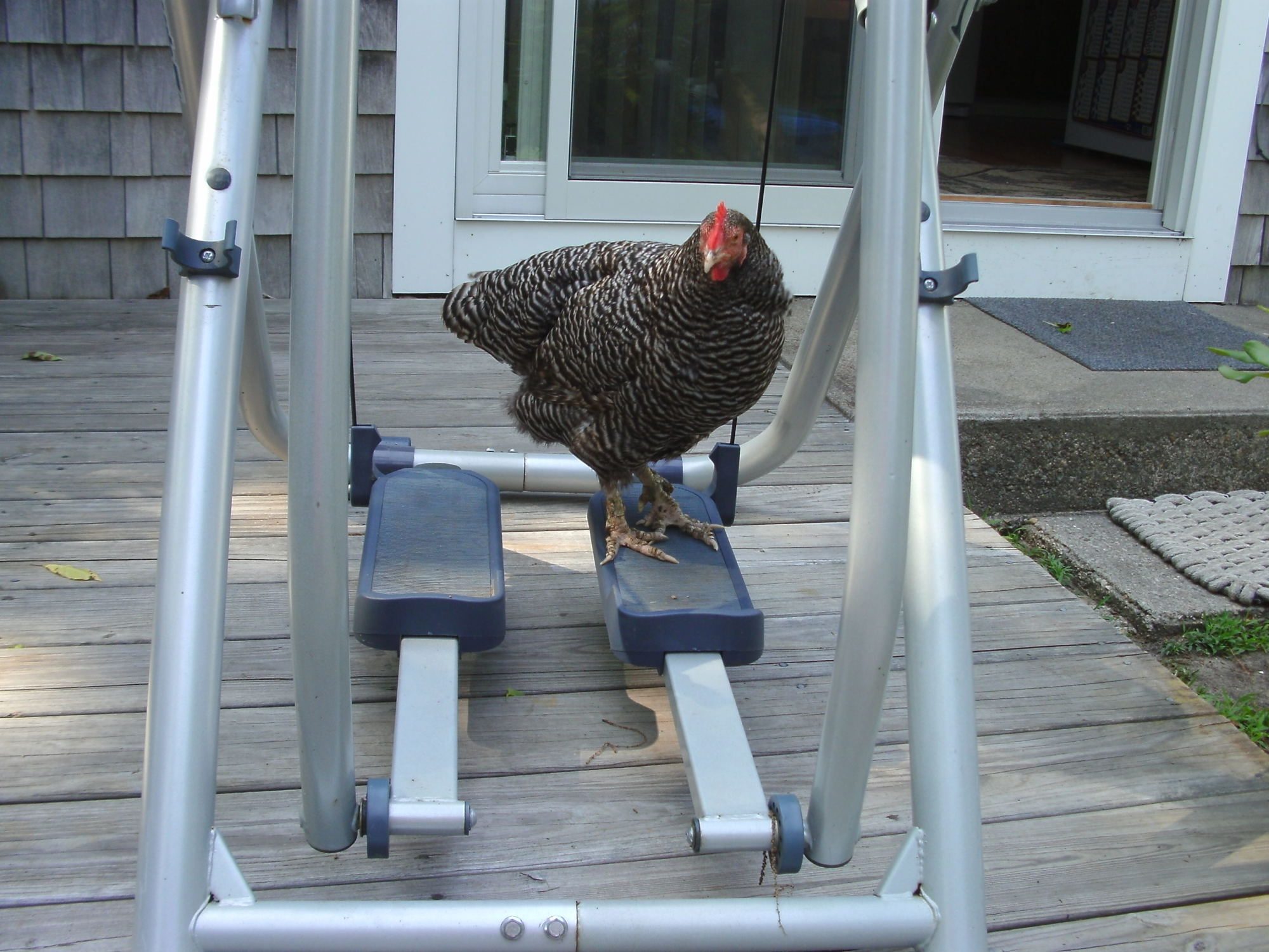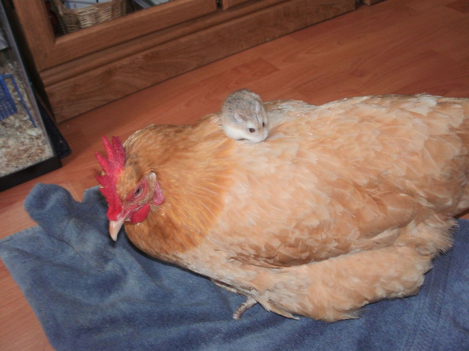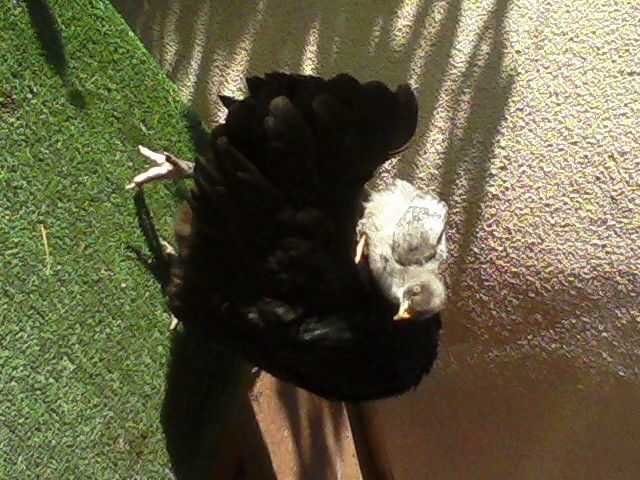 That is Olive my broody hen with her chick Garbonzo on her back.(To learn the whole story about Olive look under raising baby chicks It will say something with the word couch in it)