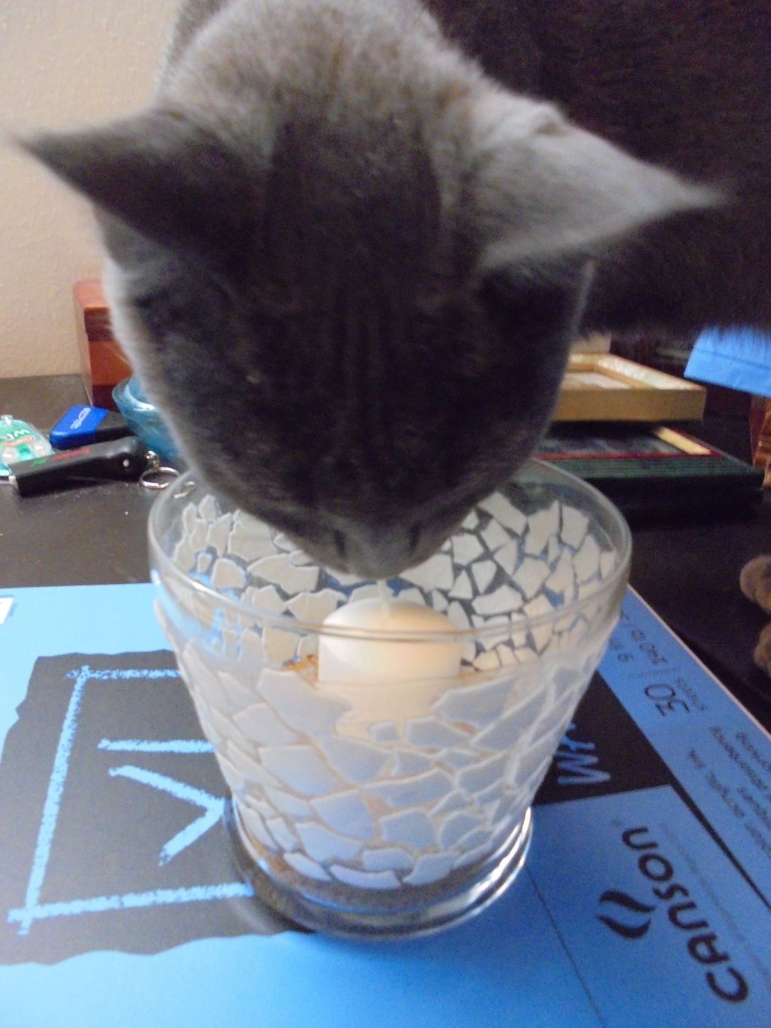 I took a plain glass candle votive and glued broken pieces of eggshell to it, covered the whole thing in a few coats of Mod Podge, added a bit of sand and stuck a little votive candle in it. My cat, Bam Bam approved!