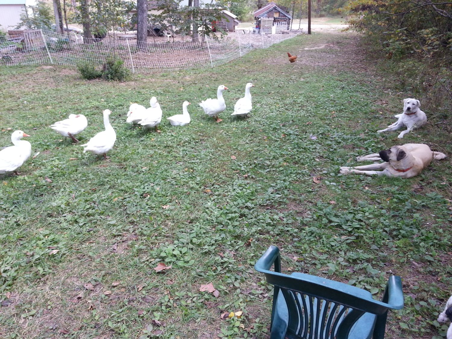 He was not trying to kill her, but just being an exuberant idiot puppy. He actually defends the chickens from food thieving squirrels and he alerts to big birds in the sky (I taught him this very easily just by barking myself and growling as a hawk flew over). When I heard a hawk close by, I said "bad bird!" and ran out to watch for it. He paid very close attention to what I was doing and now recognizes the sound and alerts when he hears it. He also searches the sky now if I say "bad bird", although he also just pays attention to the sky on his own.
