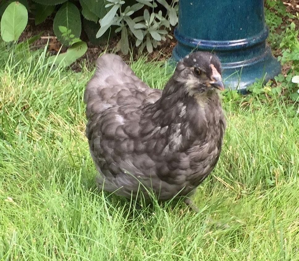So here’s Pip at 9 weeks. S/he (I think a pullet because of the flat comb and skinny legs?) is slightly smaller than my easter eggers and copper maran, fast, full of personality and quite chipper. Her/his bearing is more upright than the EE’s. I’ve included a pic with an EE and CM so that you can see the relative size.