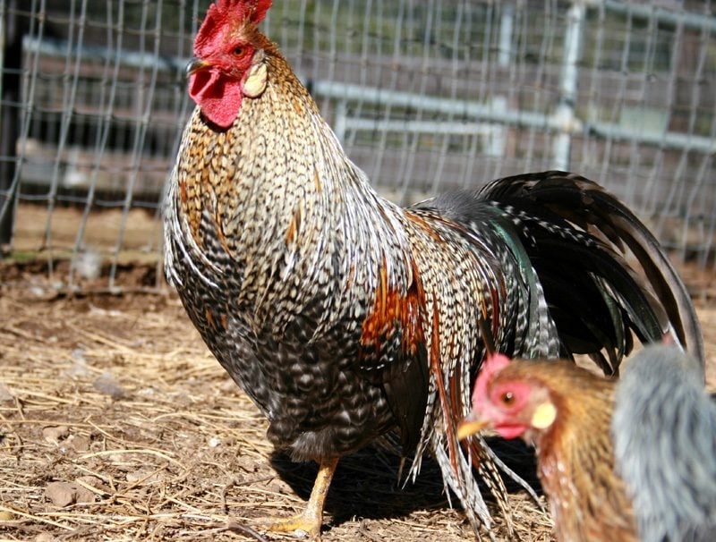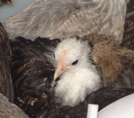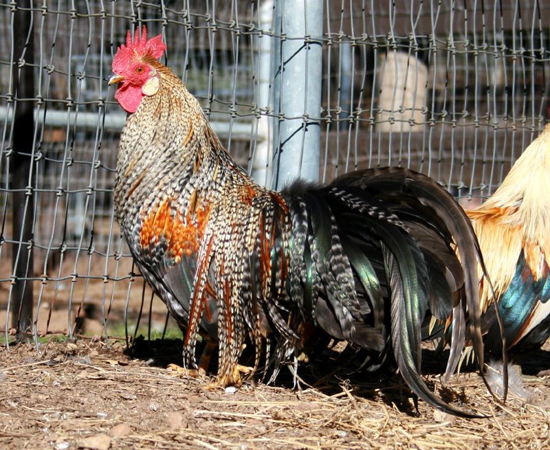 Fly-tie birds have short tails.and long saddles. The birds she has came from me through Jerry and then eggs from her. She is a good breeder. I think the one with the white head will be a barred bird. Most barr birds are black with a white dot on head. Fly-tie birds most have a white head. They look more Ohiki than anything. I like them. The barred cock is real pretty..