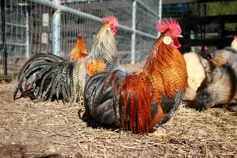 OK so that explains it then. Does that mean that these faster growing tails may not be peaking yet due to the influence of the Pheonix traits and/or Cy's bloodline? The other fast growing fellow has what I think you would call a full curtain and of the two he is my keeper. He hops on my head when I'm in the pen with him so he's got the sentimentality edge over Tchai going for him! Tchai may be the better bird of the two, I don't know yet. Here is a picture of the other fast growing fellow, Friendly, he is the rooster in the back. The lovely young roo in front doesn't have a name yetHe is from the same hatch as Friendly and Tchai, but I don't know if he is one of the fly tie crosses or not.![]()