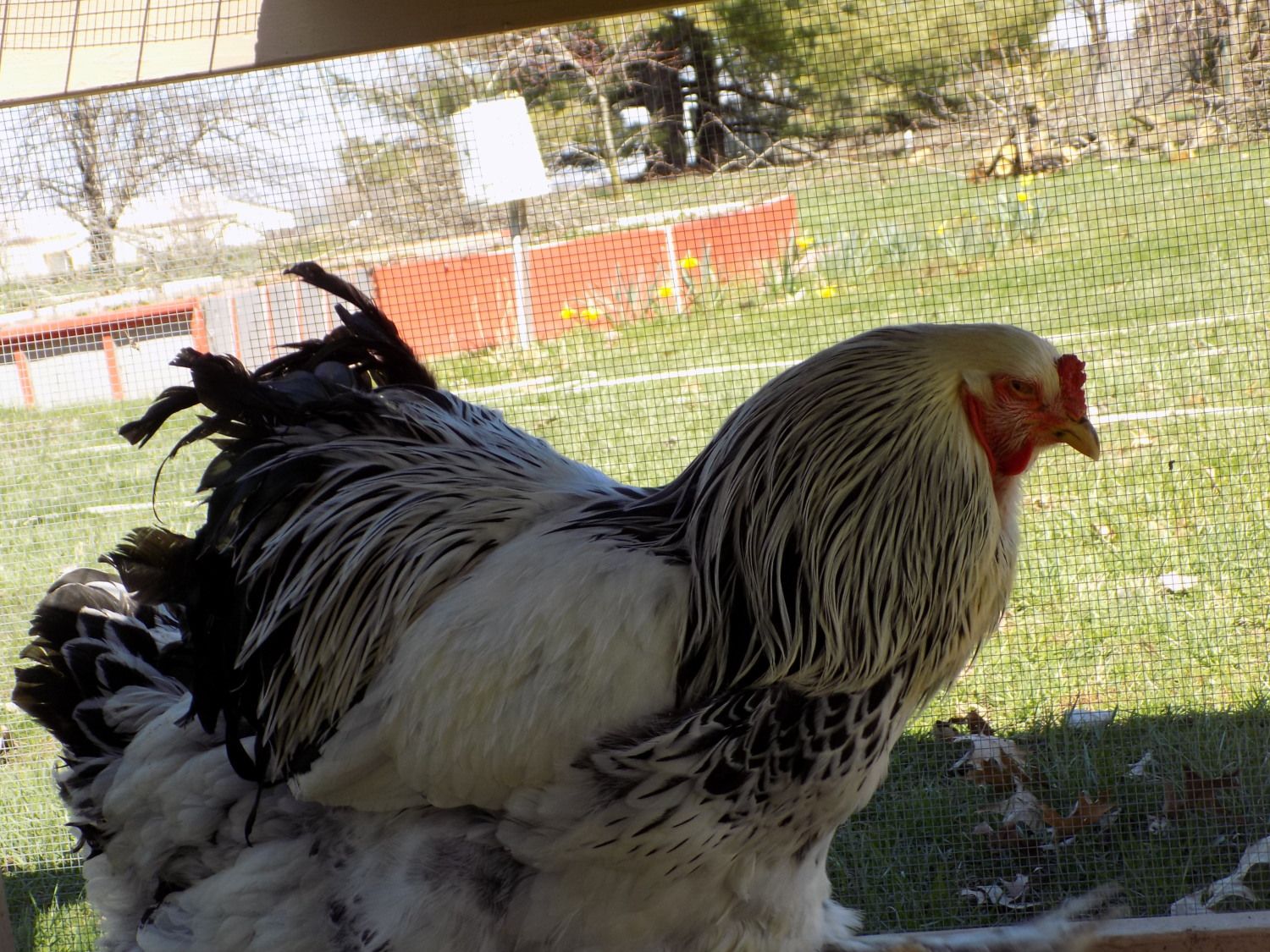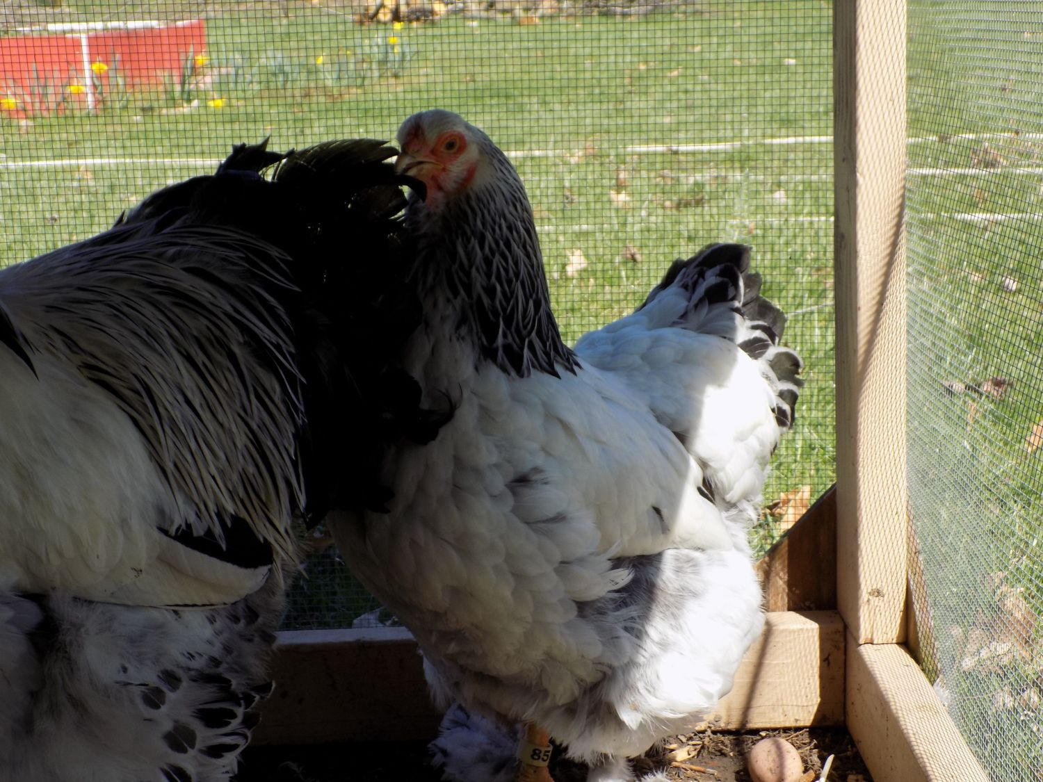 Can anyone tell from this pic if the hen is a leghorn, she lays beige eggs and has a few random grey/black feathers. I think the rooster is a leghorn. They are all happily digging through their compost piles behind the coop and run.
