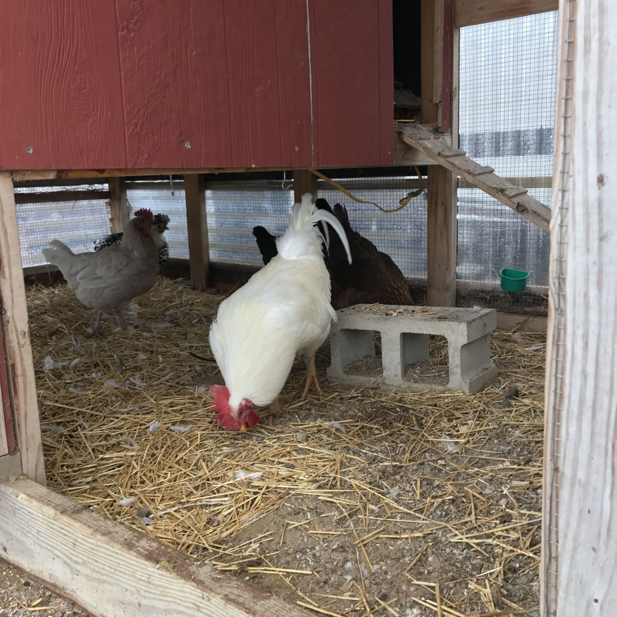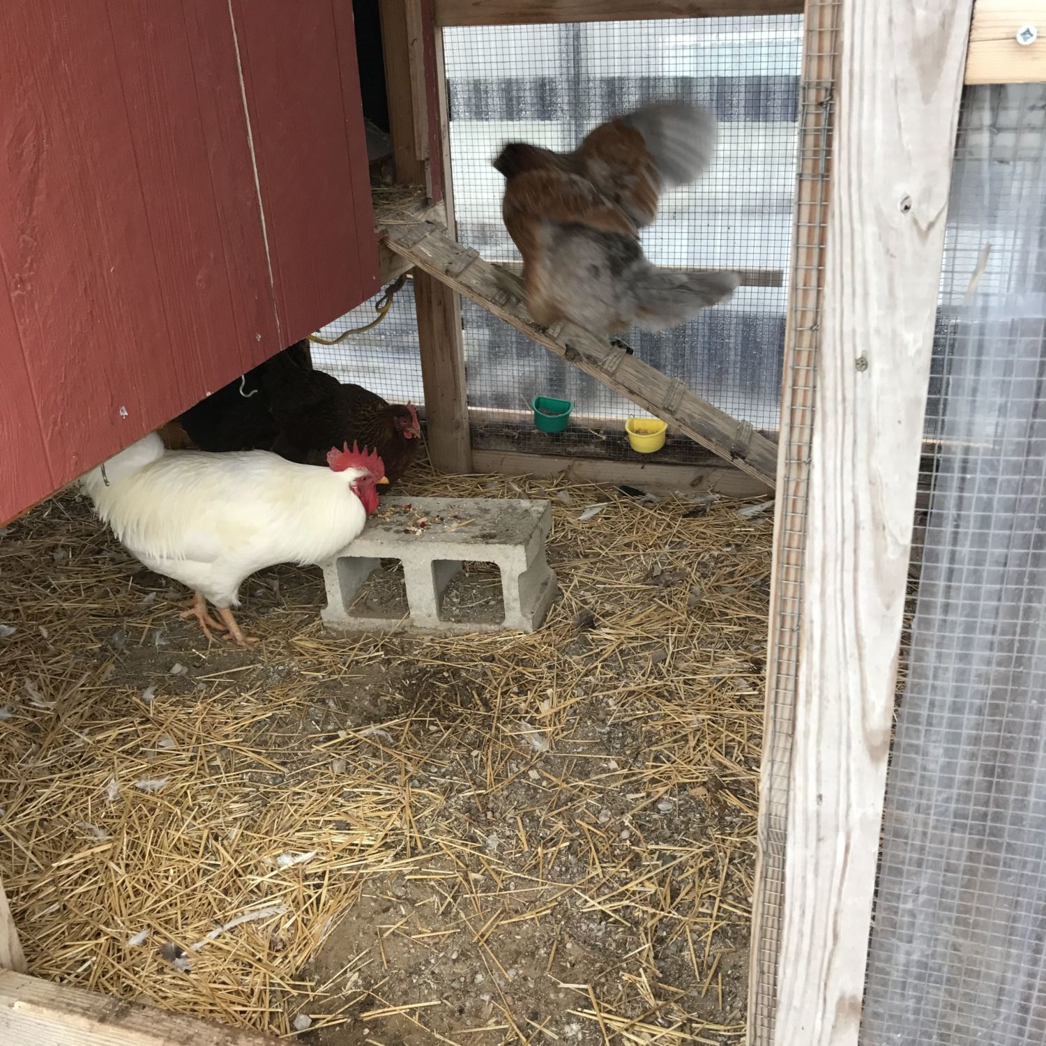 Yes, we had the wind! Luckily, I only had to repair the lattice cover over their little compost/scratch area between the coop and the fence. I'm glad I used plastic panels instead of a roll of plastic to wind-proof the run this time! Took a couple snaps of the coop yesterday. You can see the plastic wind block and the straw to keep their feet off the cold sand. The cement block is my step to reach into the coop for getting to the food and water, half of that side is a big door with a small pop door cut into it for the chooks. The block is handy to put treats on and as a perch. This little run is where they spend most of their time, (even when the run door is wide open) when there is snow on the ground or too much rain or wind. Today there is not much wind, no rain, and fairly mild, so they are out and about in their free-range yard (there area that our 1/3 acre fenced in pond is).