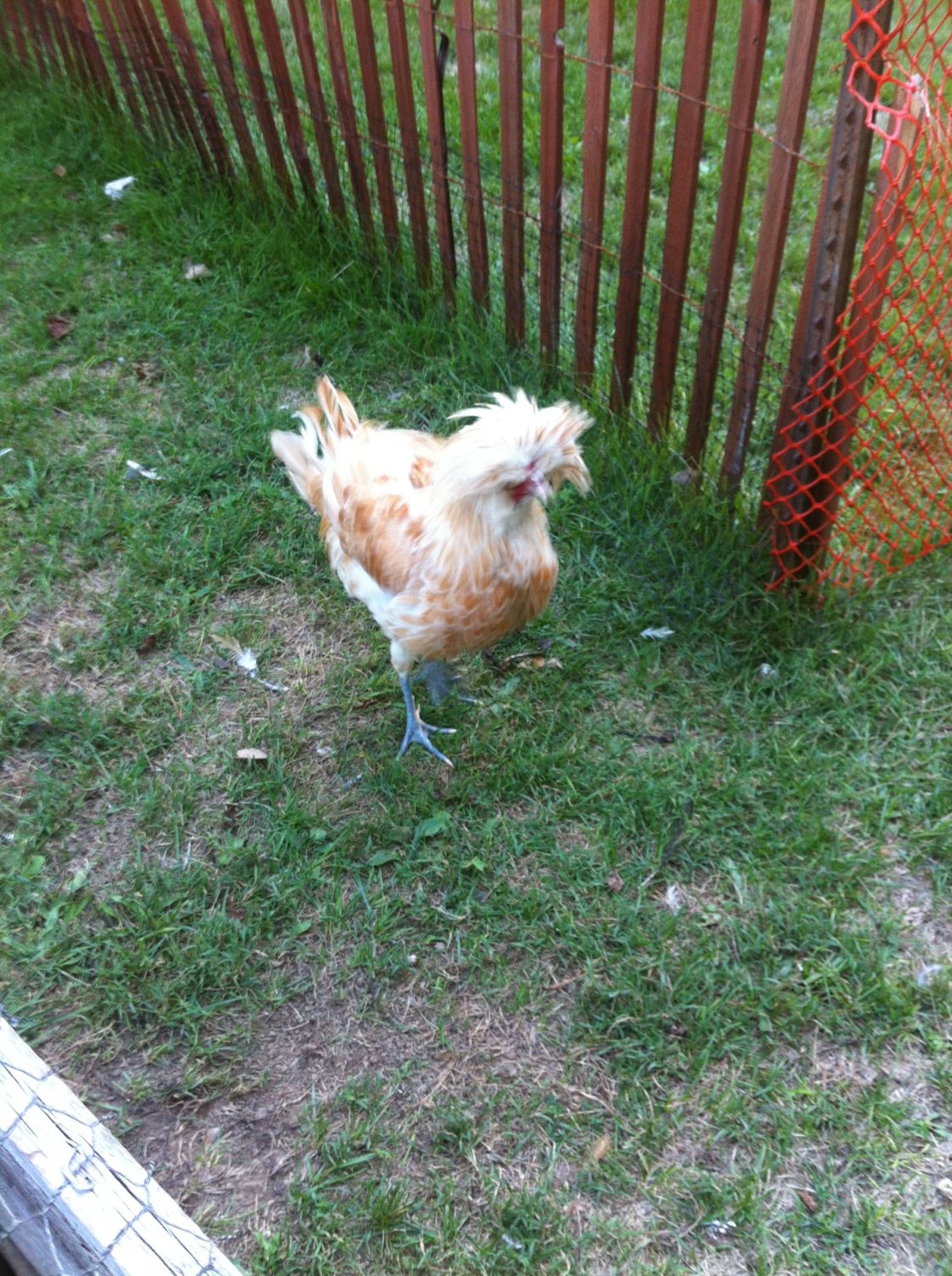 This is the view through the back end of the A-frame. The nesting area is accessible through a hinged door. You can see the roosts up front.