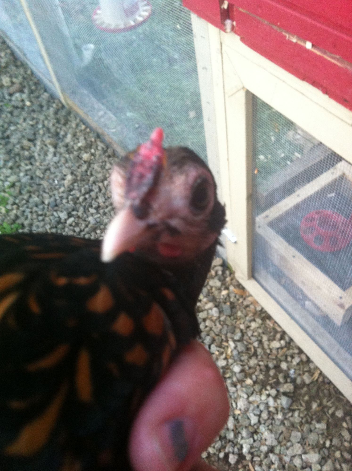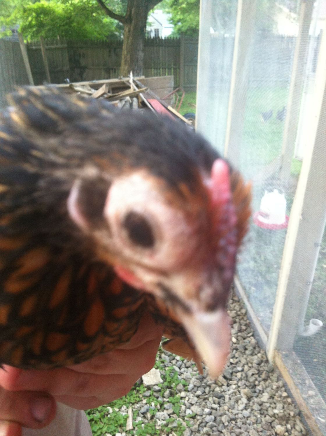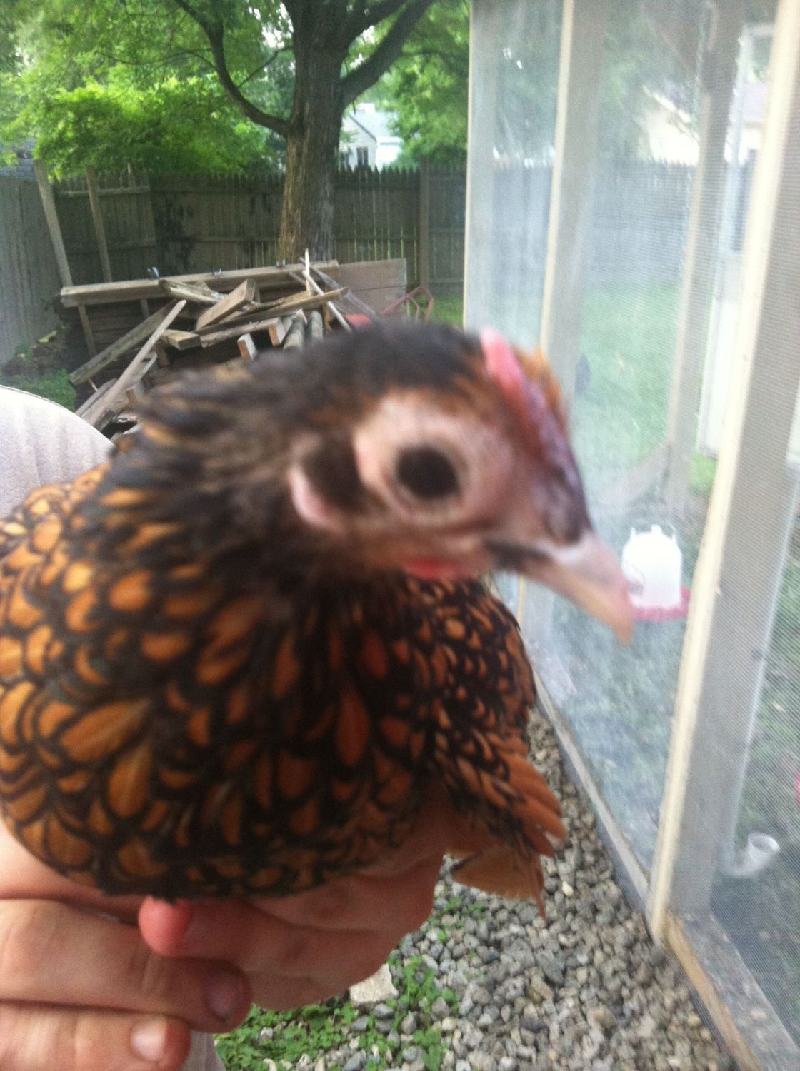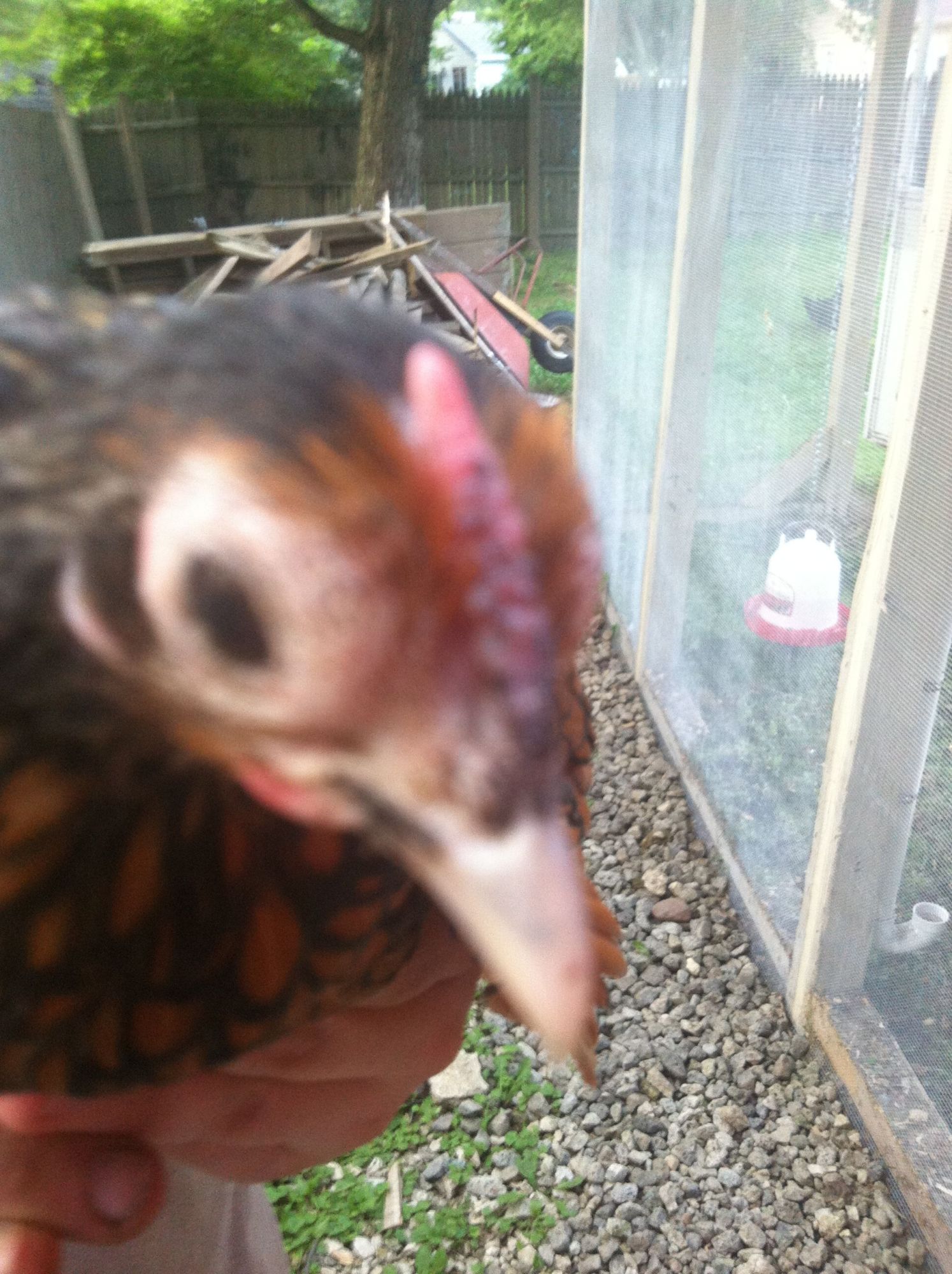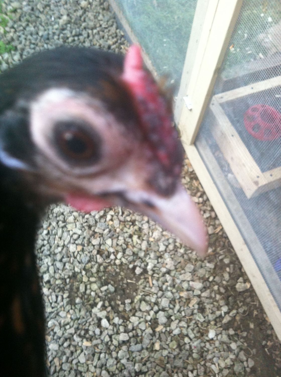 My husband told me about 20 min ago that the hawk (that we used to see regularly but haven't for a while) was back, that he saw him earlier today. I immediately went outside. I heard the chickens having a FIT. I ran down (barefoot) and one if our polish girls was ON TOP of the coop! No idea how she got up there, I have never seen her so much as flap more than to just stretch everything out...