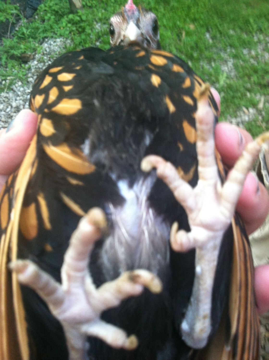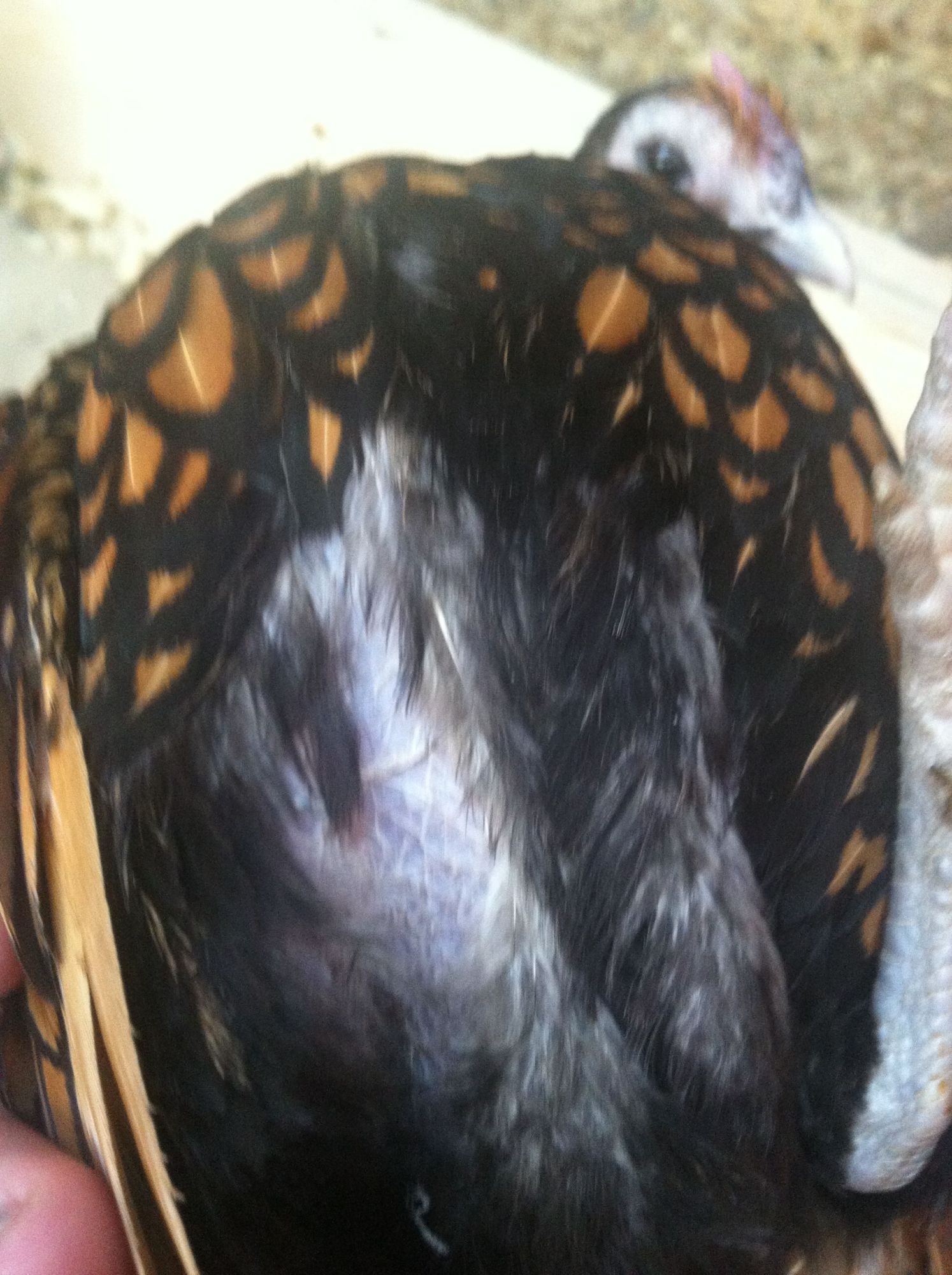 Is anyone familiar with seabrights? I adopted a couple of hens. The definetly have mites which I am coating them in wood ash to help with although other suggestions are welcome. I am feeding them fresh garlic, adding DE to their food and Apple Cider Vinegar to their water. My question refers to one hen that has no feathers on her abdomen. They are not laying yet so while I know some broodies pick out their feathers I don't think that is the case here. There is no redness or swelling, no cuts or scratches just no feathers. Can this be indicative of something or is this something that happens with mites? I am basing mite diagnosis on white clumps at bases of feathers and tiny scabs on the comb and other exposed areas like around eyes. I am newish to this and certainly may have overlooked other possibilities in my research. Also these guys were not well cared for previously and if anyone knows of other things I should be watching for that would also be helpful. Thank you all for any insight or knowledge you can offer. Hope these pics help.