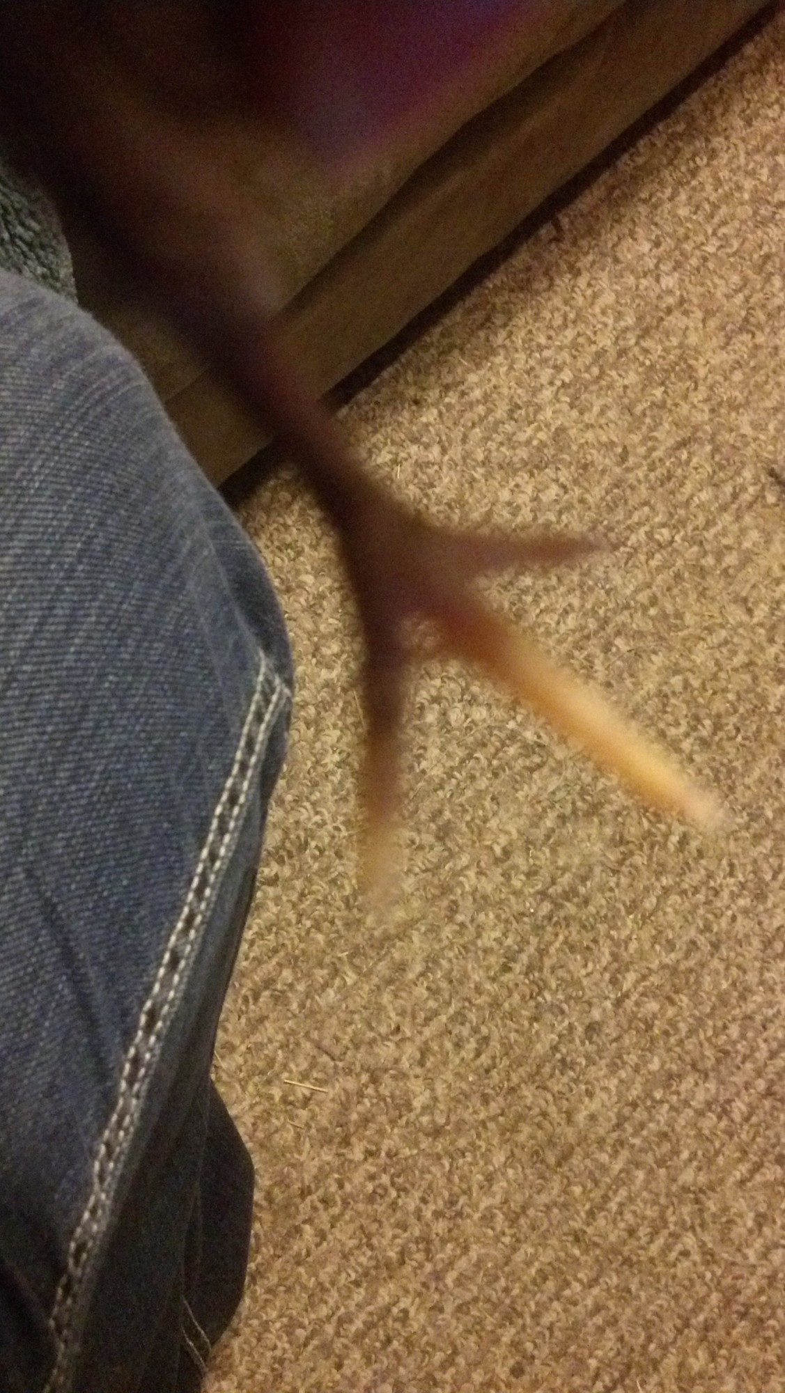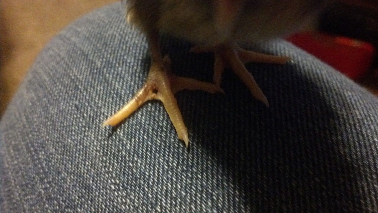 this us one off the bigger boys. You cab see his got some redness to it but otherwise is ok. I also noticed 2 of the boys have a couple tiny feathers on their feet/legs. It looks like a flap of skin in this picture but it's a feather. I'd say these guys might have some feather legged birds in the background.