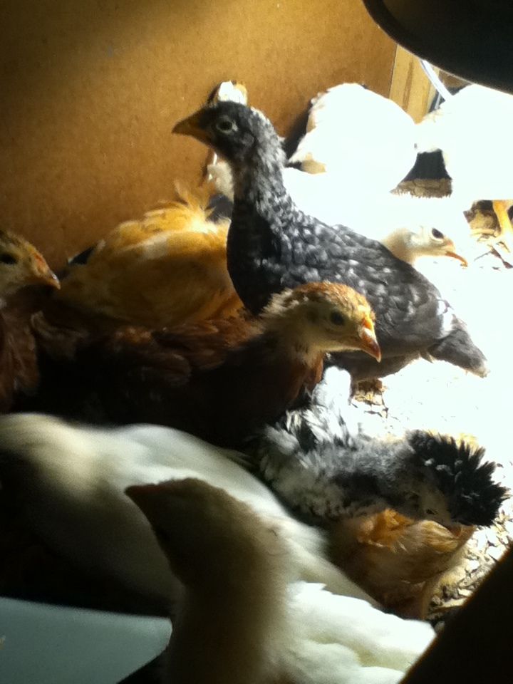 I've managed to avoid TSC and other feed store babies so far, as much as I've been in there. Saw Cornish Rocks, Light Brahmas and white Silkies (terrible, awful, awful quality) at TSC today. Visited TSC a few days ago and they had about a dozen Tetra Tints and Pekin ducklings left. I asked the guy there about mixing chicks and ducks (say, 4 chicks to 2 ducks), since their sign clearly reads "a minimum of 6 BIRDS". He was adamant they couldn't do that. ..Yeah, right. Also was adamant it was state law. I'll stick with the little local feed store where you can mix and match whatever the heck you want, and take as few as one.. Anyways, I stepped to the side to discuss how many TTs I wanted to get with DH and stepped back to an empty brooder. Saw some lady with the lot of them at the checkout counter.. Probably just as well..my 27 Meyer babies are eating me out of house and home lol. They're almost 5 weeks old now. These pics were about a week ago.