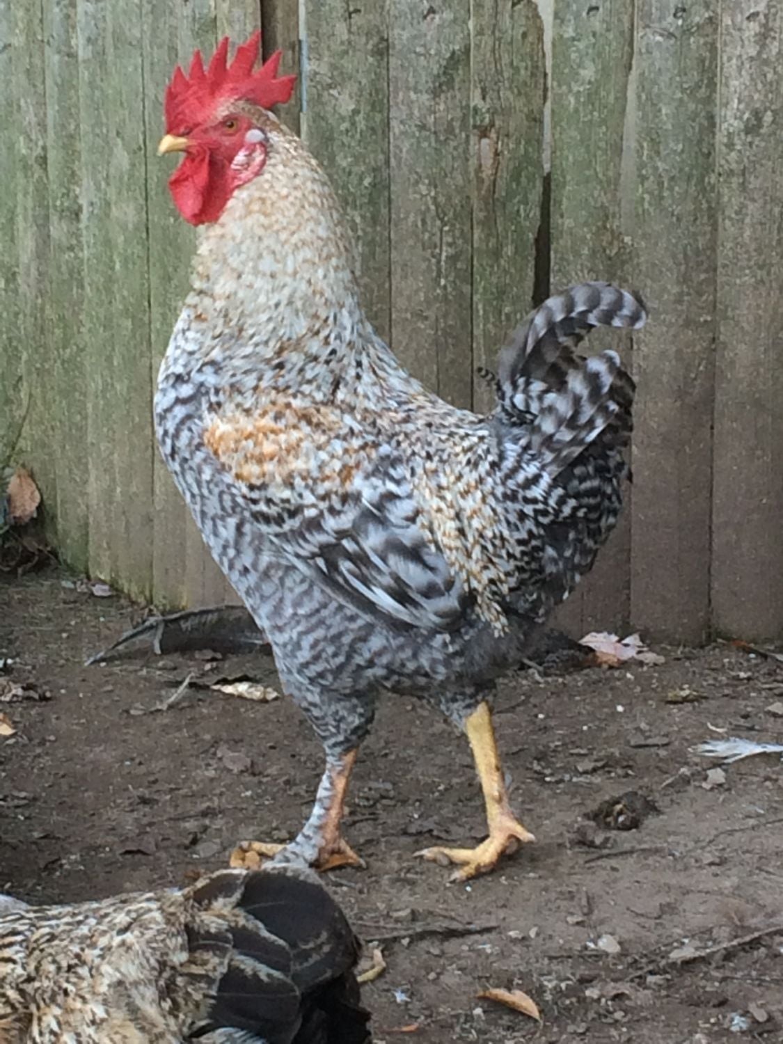 1) Large, gorgeous red boy, walnut comb, barred feathering. Cross between Golden Cuckoo Marans and Crested Cream Legbar. Coloring is amazing--deep, golden red in the sun. The pics are not the best (I-Phone) but they are not enhanced whatsoever--he glows in the sunshine, a molten reddish-gold. Beautiful! $12.00