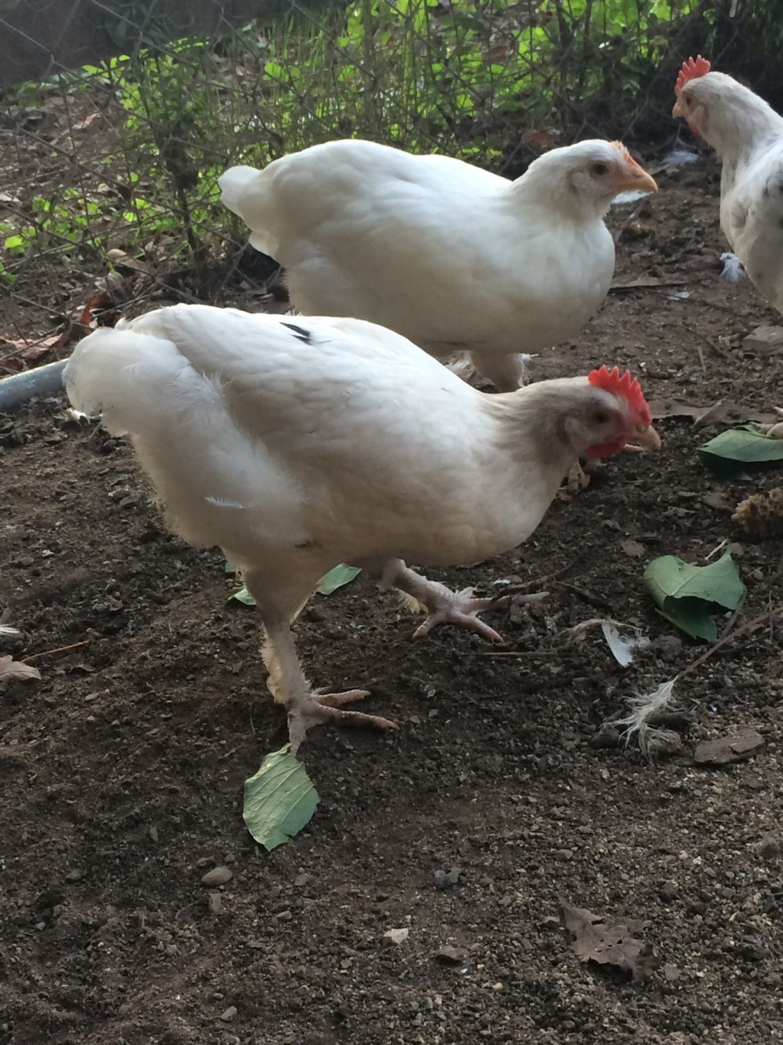 The two younger cockerels are just starting to crow--both mostly white with blue splash dots/spots. They both have feathering down their legs, no doubt their dad was George, my Blue Splash Marans rooster...R.I.P.