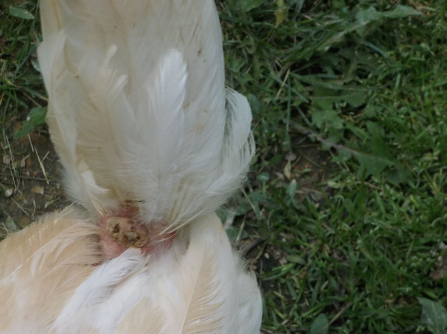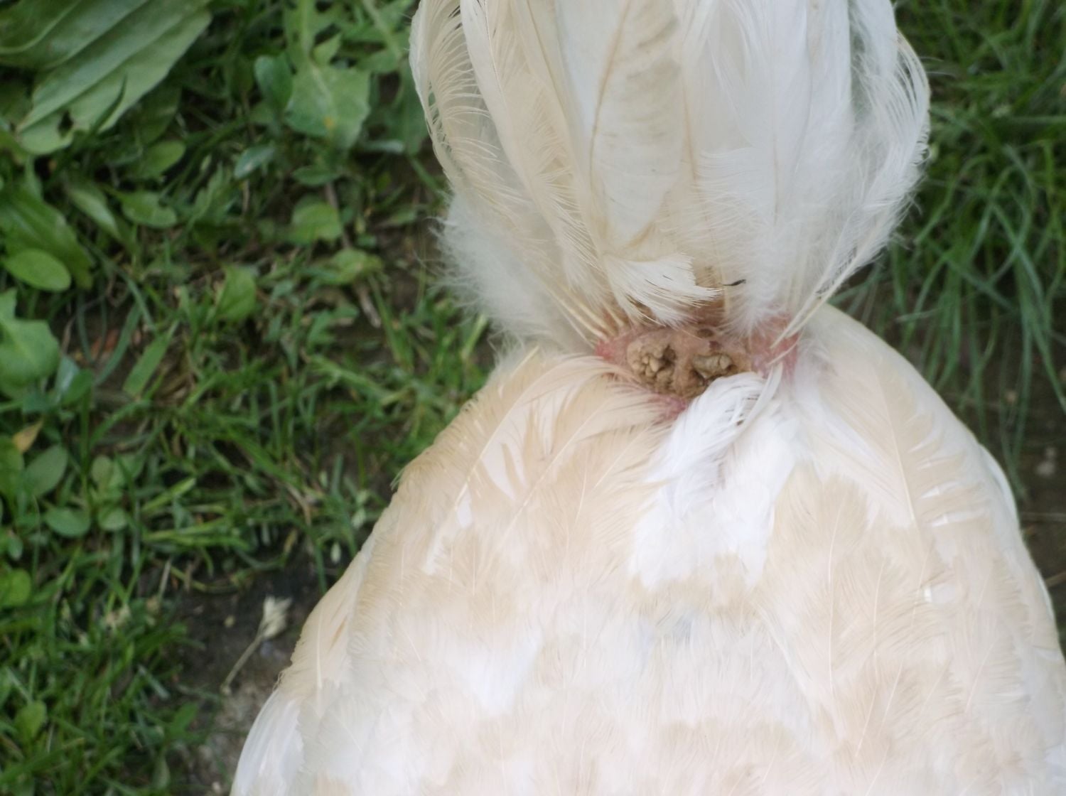 My hen was viciously attacked by guineas last year and nearly died. The incident left her without feathers and her oil gland looking like this. Each side looks like a tiny, dirty cauliflower head. I see no actual oil gland that sticks up. Should these "cauliflowers" be cleaned? They aren't red/inflamed looking, more like hardened, dirty oil. Am I to assume correctly her glands were pecked open and have never covered back over?