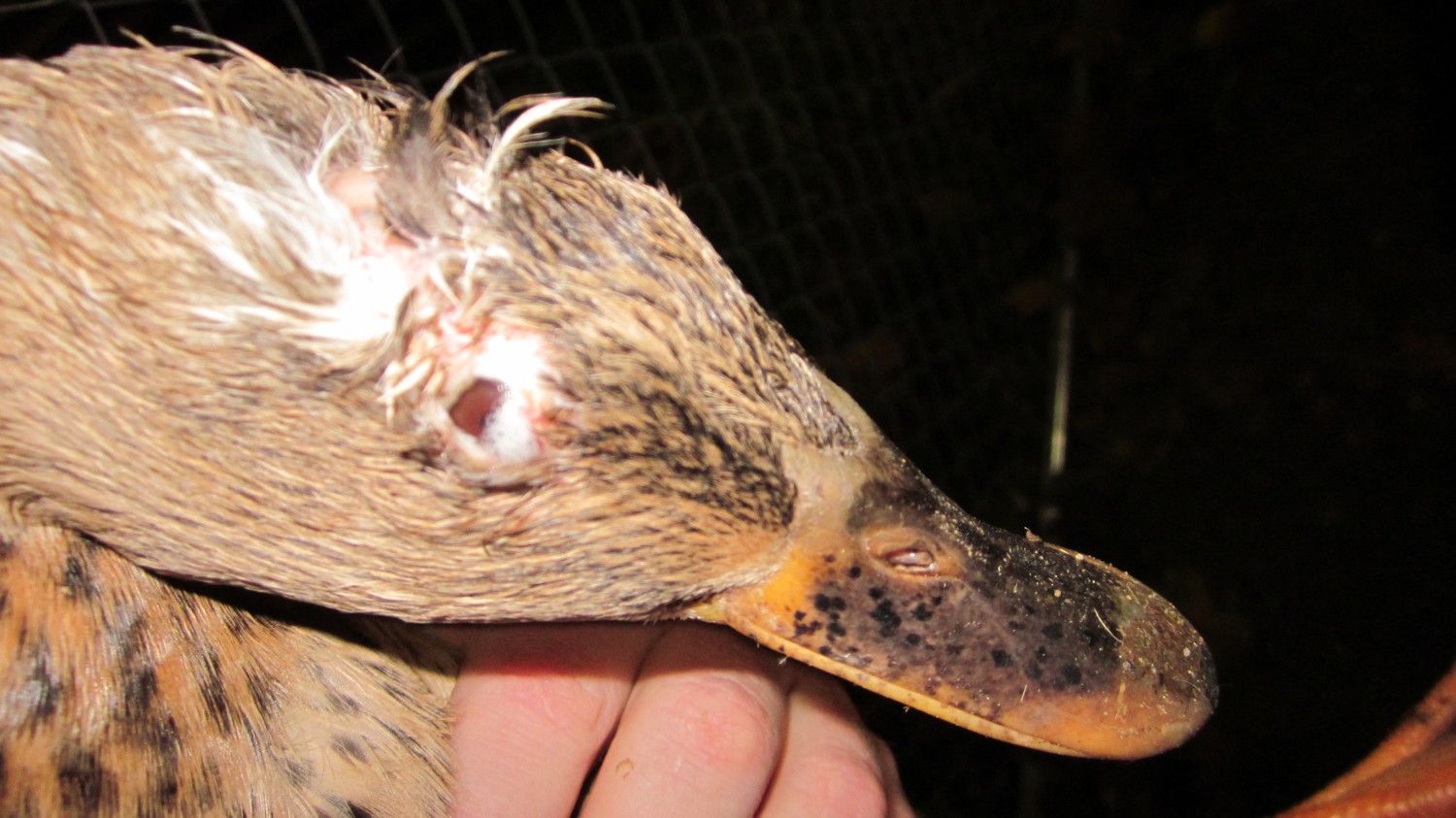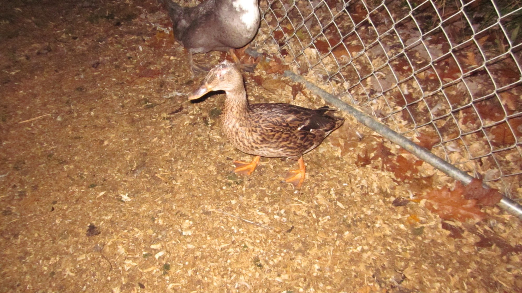 I was at the feed store today and somebody had dropped off this wild mallard girl. When she arrived, her face was completely mangled from over-mating of the males. All you could see was a bloody mess on her face a few weeks ago. I inquired about her today and they let me take her home. I already have a duck that is blind so I figured they could be buddies. Upon closer inspection I saw that there were tears coming out of little tiny holes on each side of her head. Her eyes were still there, but skin had healed over them! I could see the third eyelid blinking under the skin. This is where I hope I made the right decision..... I sterilized a scalpel and carefully cut through the skin in one fluid motion and there were her bright and clear eyes! I flushed them out thoroughly and put in some antibacterial eye drops. She had a lot of debris stuck under the skin such as dirt and pine shavings. There was no sign of infection (the bubbles in her eye are from the drops). When I put her back down she began running around the pen and biting at the other ducks, then she tried to fly away! I have since clipped a wing to keep her grounded. What does everybody think, was this cruel to do, will they simply heal back over?