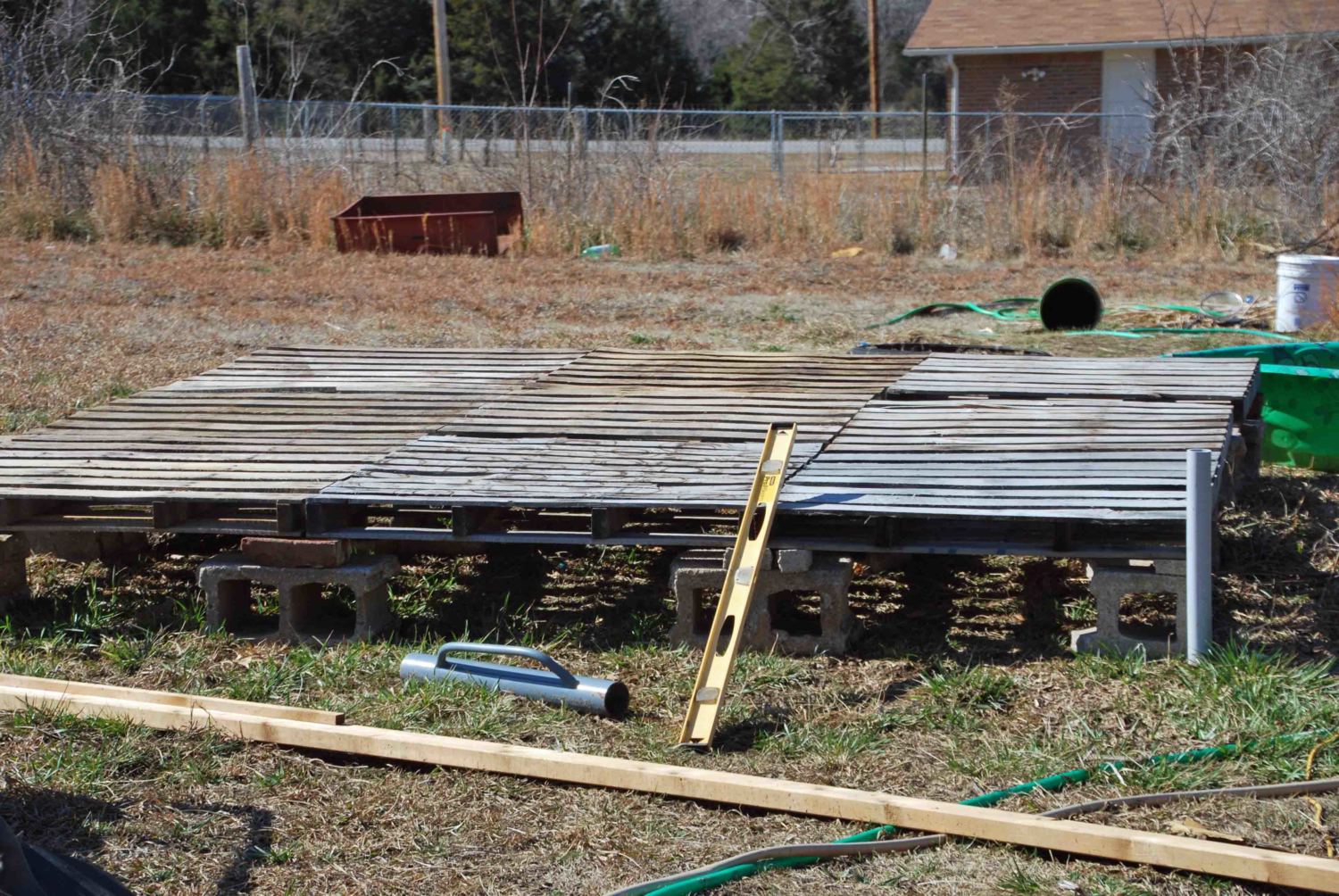 The beginings of the pallet floor. Blocks, bricks and pallets all free. ( just work to get them)