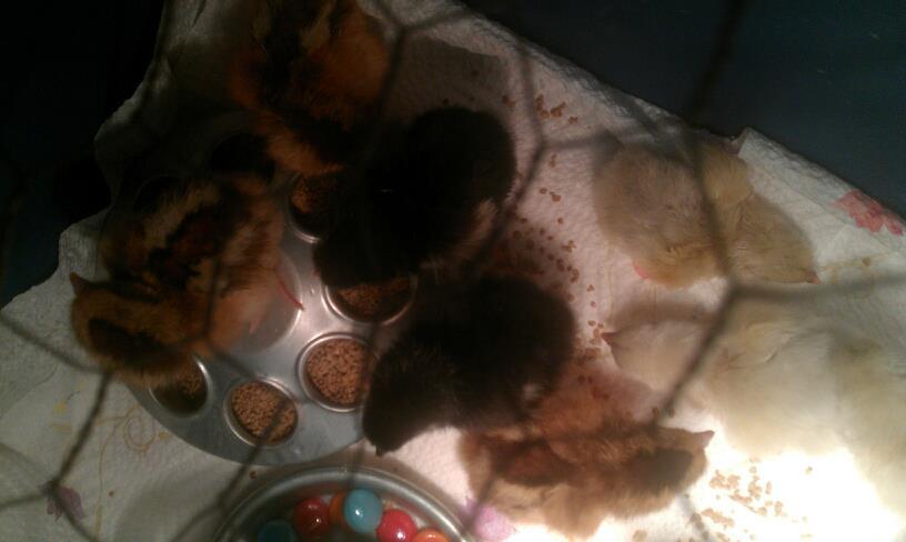 Lookie!!!! My first feather babies hatched at Carl's. We had 13 of 14 eggs hatch. We have 5 black australorps, 5 blue splash marans, and 3 golden salmon marans. They are all settling in nicely. We only have one that isn't as active and it hatched about 2 hours ago so a little behind the curve.