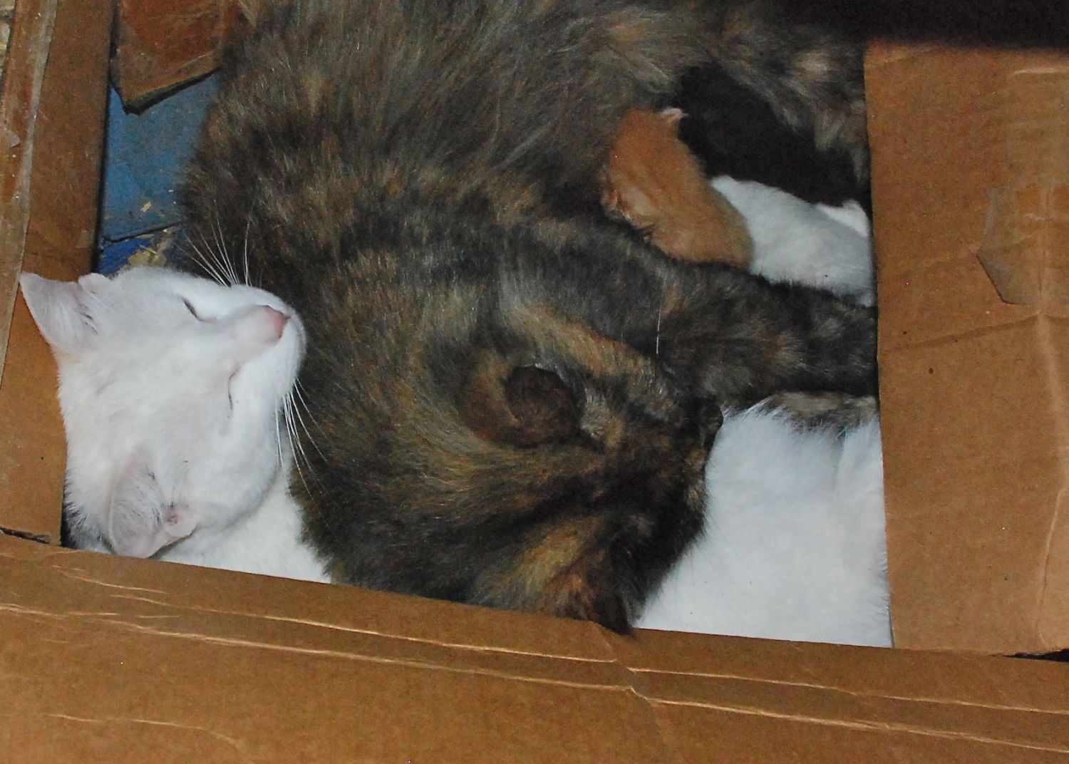 Poco Pollo - cute cat pics! It is unusual for the cats to share quarters like that with their kittens but glad it's working out.