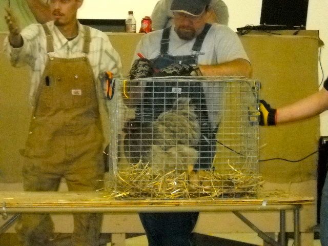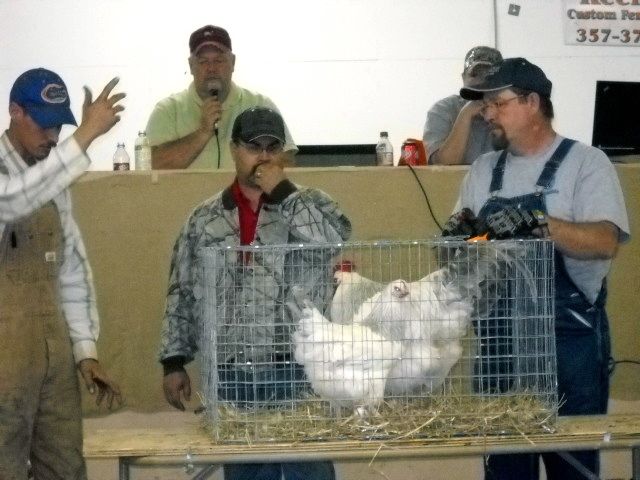 There were some white peafowl that went high last night: around $130.00 each. Joe sold some amazingly beautiful birds last night. Prices were way, way out of my range on the really nice birds. I did get a lovely travel cage: no pictures yet. It's made of cedar and has a wire screen floor. I think it will make a great transport cage if I ever find myself taking a bird to a show. I bought four Cuckoo Marans babies for $3.50 each. They're an active bunch, and I plan to put them with the Marans chicks I got through the Easter Hatch A Long. I also bought hatching eggs, so I'm going to set a new tray before bedtime tonight.