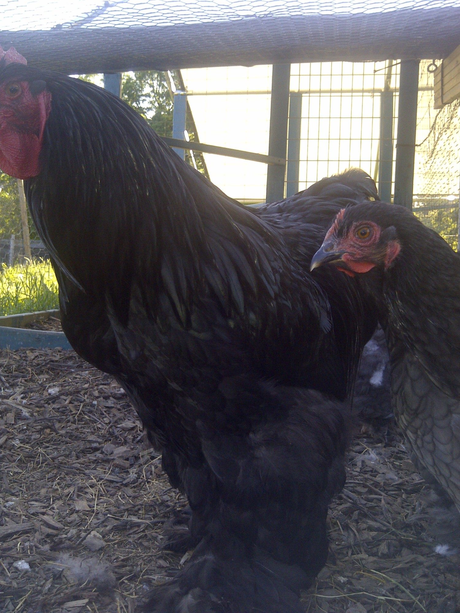 Annabelle is the bigger of the two, has a broader head and a yellow leg band. Part of her comb is missing.