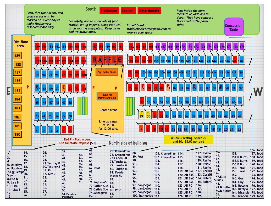 For folks who didn't get to go to POOPS, and for those who went but want to mingle with chicken folks again, there will be another big chicken gathering on June 16th in Muskogee. If you want to reserve space to set up and sell your birds or bird related items, please send me a message. Here's a map of the show barn we're using at the Muskogee Fairgrounds. The blue spaces are available, and other colors are reserved.
