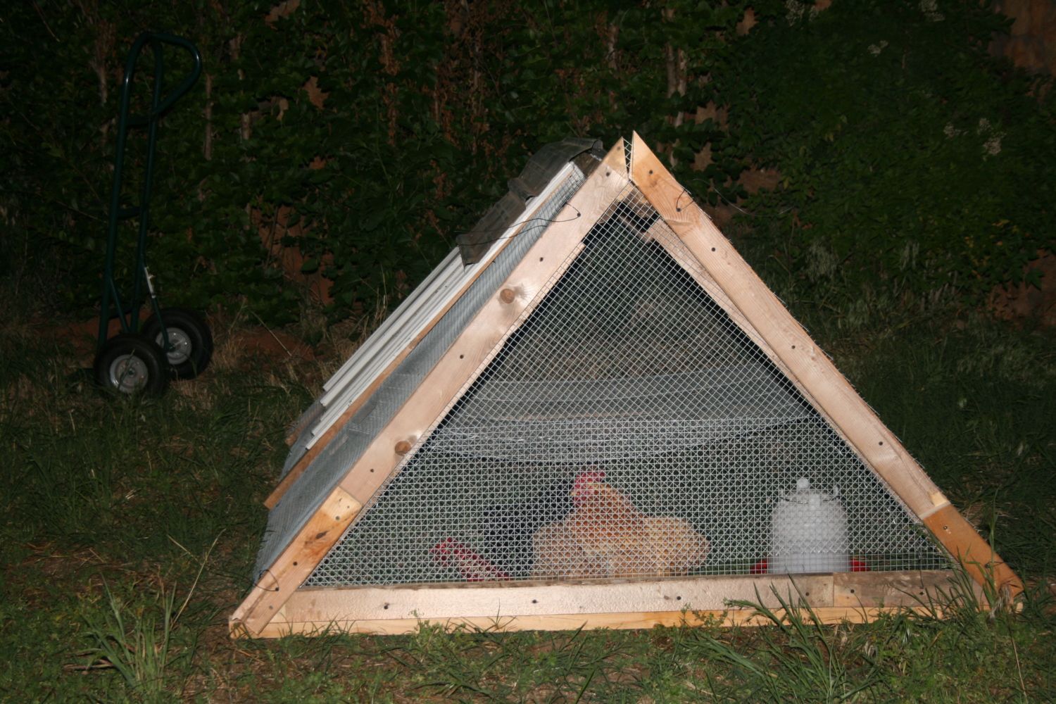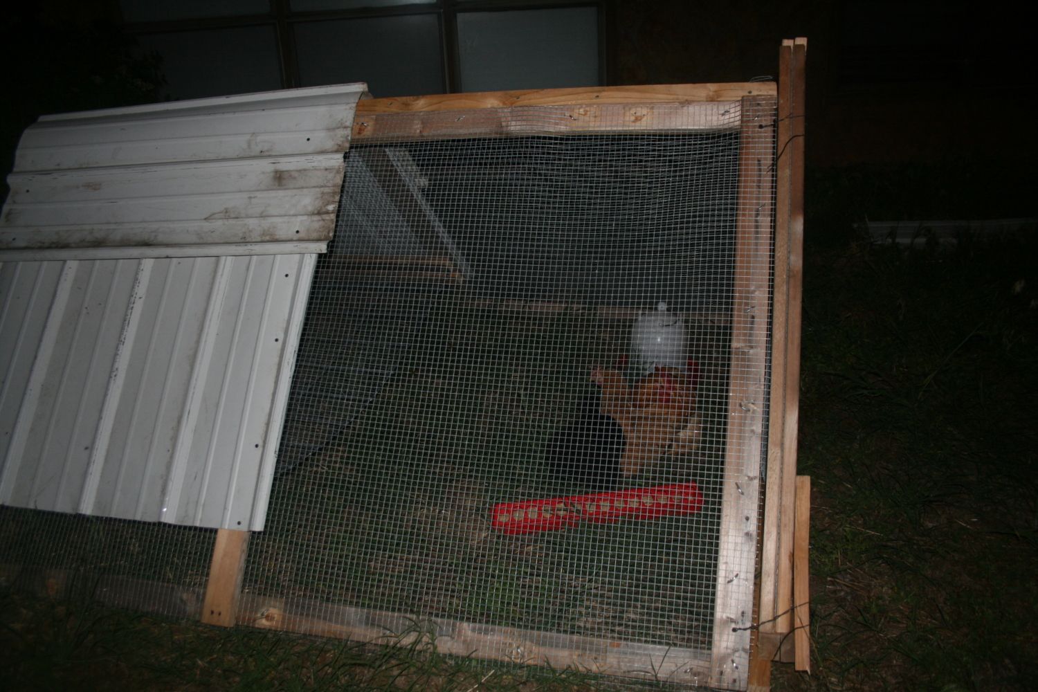 I just finished my chicken tractor for the little cochins and silkie I got at POOPS Saturday. Come to think of it, scaling up from one chicken in a big dog crate to four didn't work out so hot. The rooster, one cochin hen and the little silkie hen are in the tractor. It was TOTALLY FREE! I didn't spend a dime on it! Had stuff laying around left over from other projects and gathered some stuff from a friend's junk pile, and BOOM! There it is.
