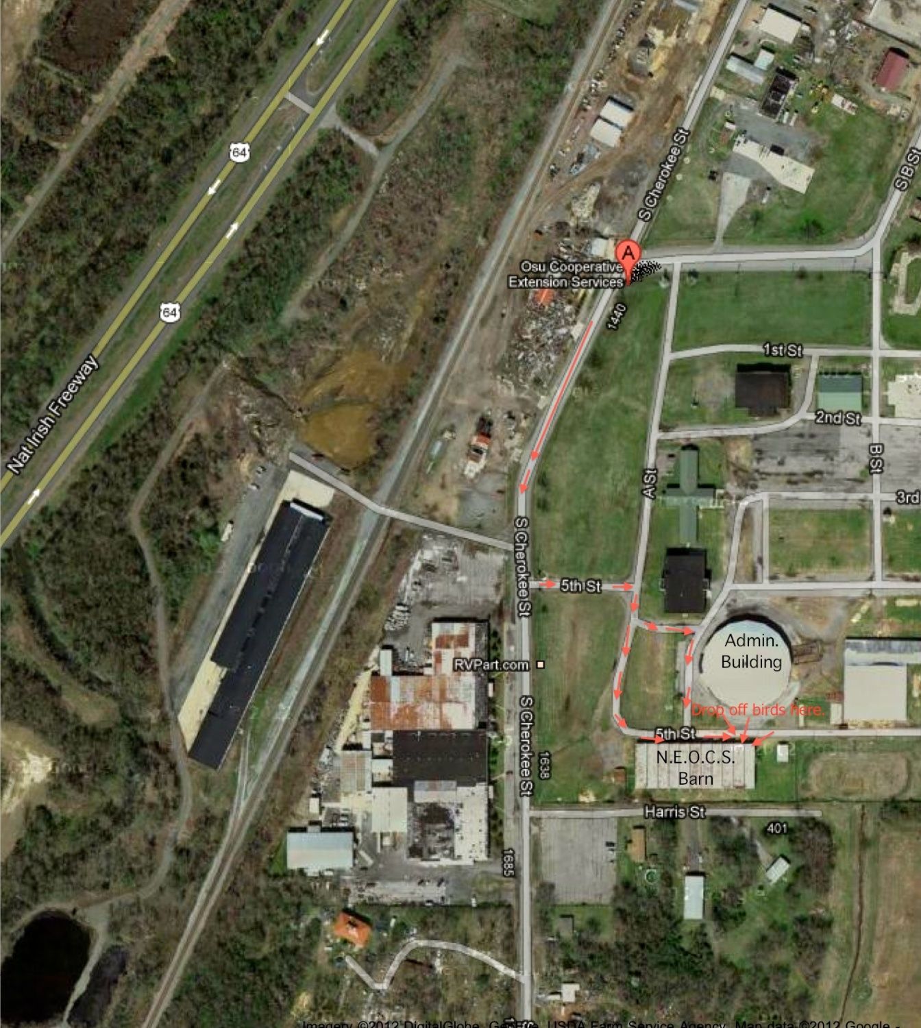 The barn is labeled N.E.O.C.S. Barn on this map. Enter from S. Cherokee Street onto 5th Street. Follow 5th street around to the front (north side) of the barn. Go to the END of the barn, the east end, and drop off your cages. If you unload your cages at the west end of the barn, you'll have a long way to walk with them later. Park your vehicle after you move your cages into the dirt floor area of the barn. Still can't tell where the east end of the barn is? Look for the round administration building. Imagine the middle of this round building. That middle point is approximately at the end (the east end) of the barn. Aaaahhhh Haaaa! Yes! That's where the fancy sign will be directing you to Please Unload Your Cages Here : )