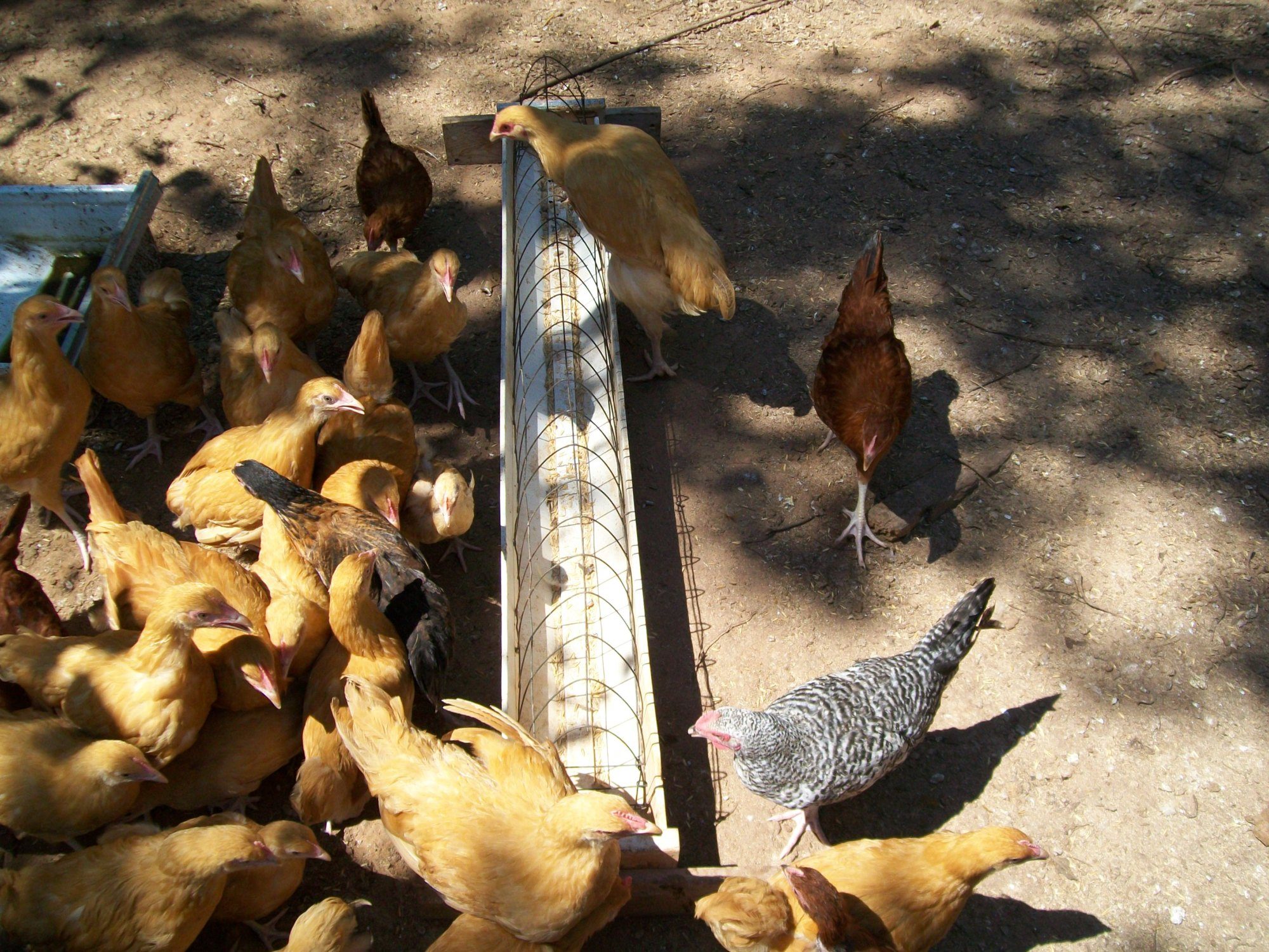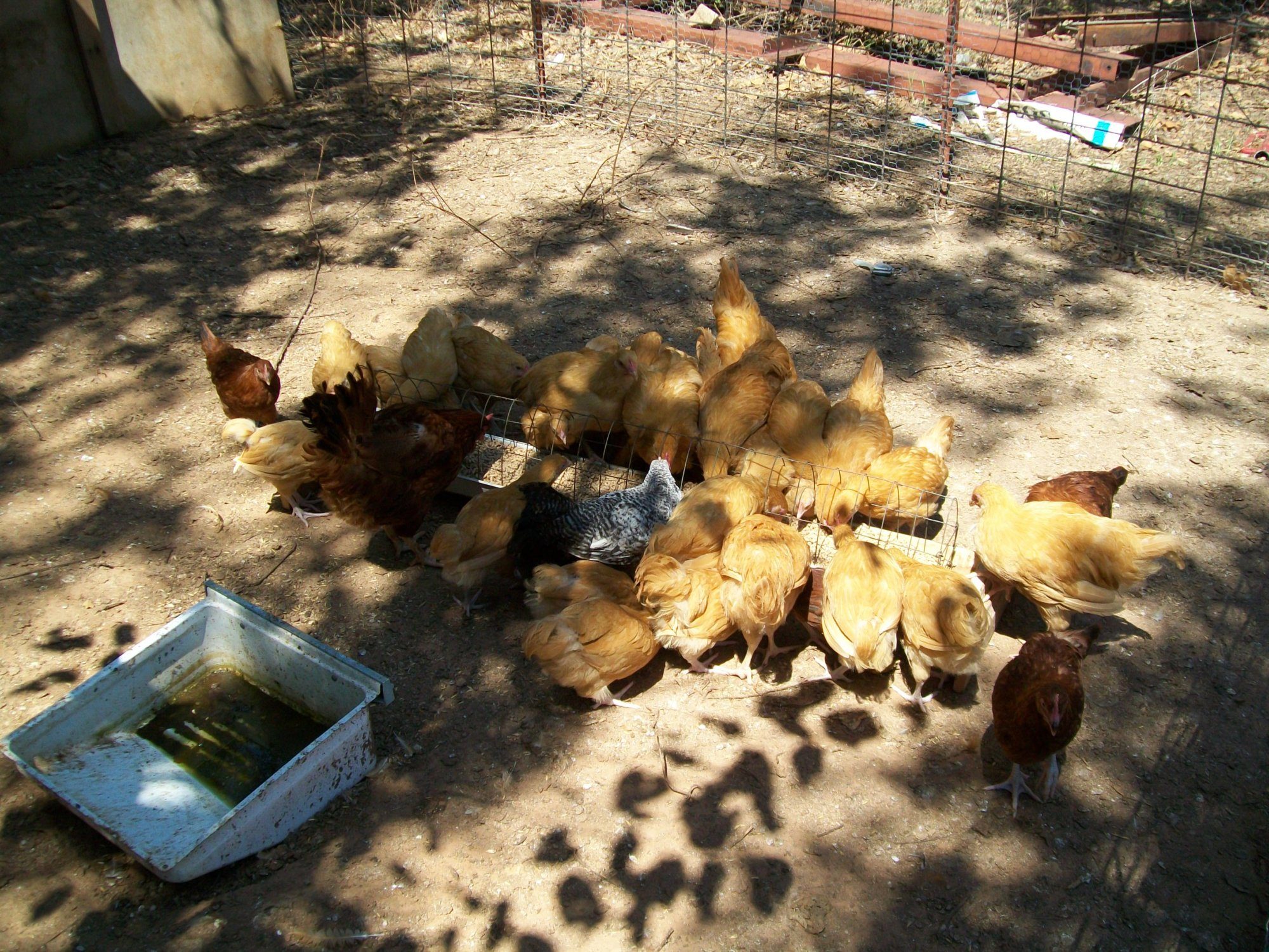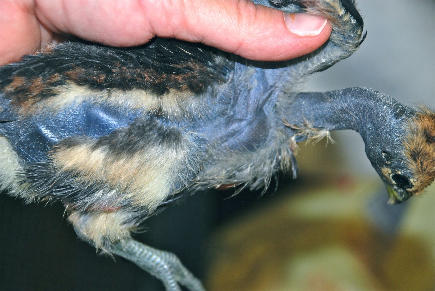 Joe - Take a look at these photos and let me know what you think regarding the scaleless gene. All four of the babies have a stripe of smooth skin from head to vent on both sides. You'll see this in the photo of the brownish chick held on its side. I've got two white and two brownish with red on their heads and shoulders. Lighter feathers keep showing up, so they may be some amazingly different color as adults. Have you butchered any of your black-skinned Naked Necks? I'm wondering if the meat is dark. I've heard that Silkie meat is as dark as their skin, and I'm curious to know if these black- (so black they look blue) skinned birds will be like Silkies in that regard.