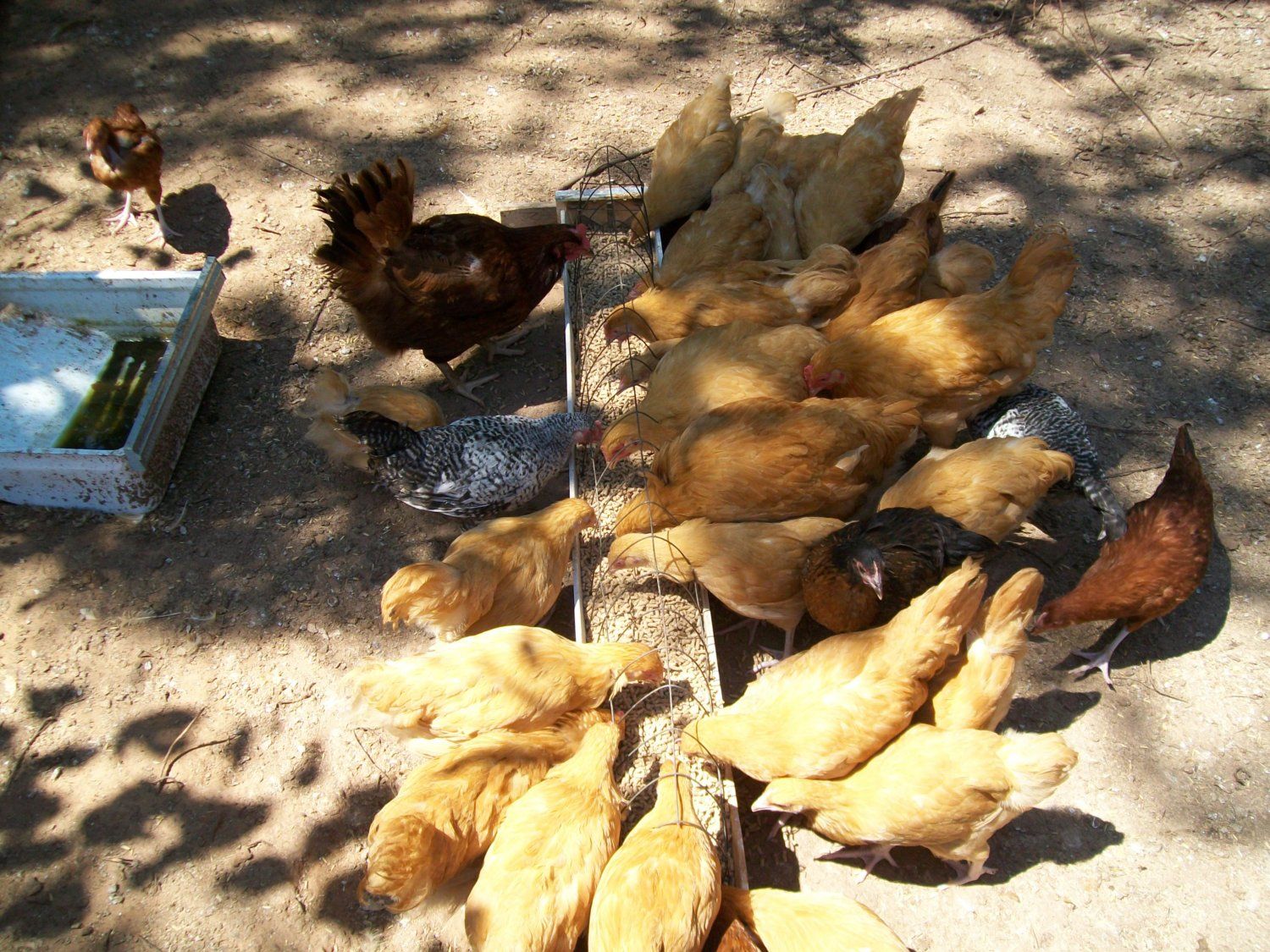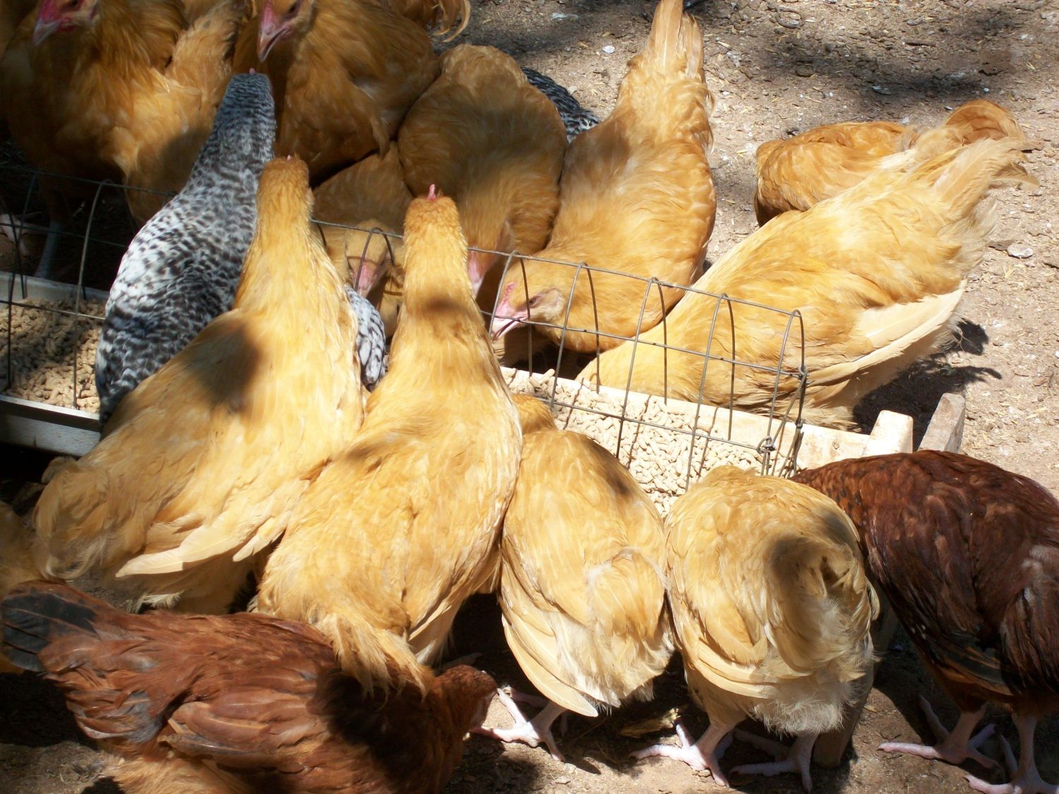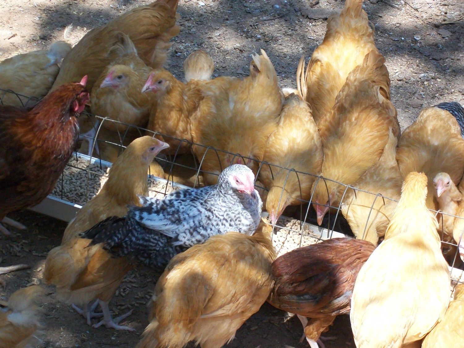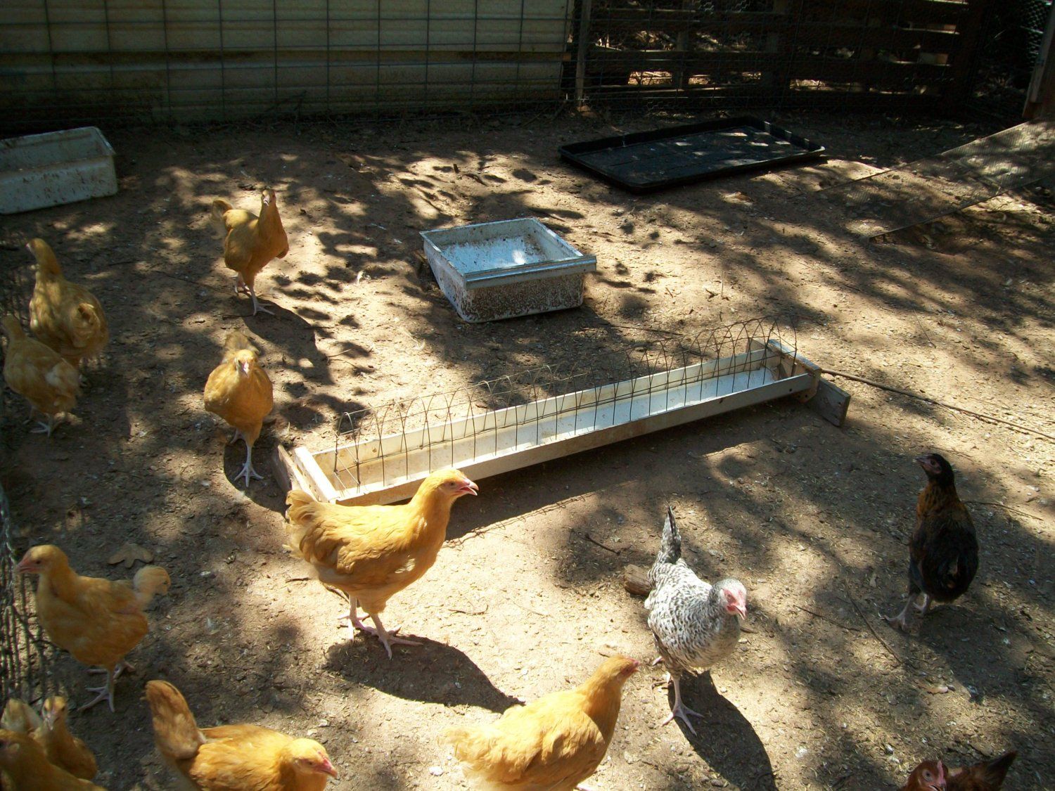 Joe - Take a look at these photos and let me know what you think regarding the scaleless gene. All four of the babies have a stripe of smooth skin from head to vent on both sides. You'll see this in the photo of the brownish chick held on its side. I've got two white and two brownish with red on their heads and shoulders. Lighter feathers keep showing up, so they may be some amazingly different color as adults. Have you butchered any of your black-skinned Naked Necks? I'm wondering if the meat is dark. I've heard that Silkie meat is as dark as their skin, and I'm curious to know if these black- (so black they look blue) skinned birds will be like Silkies in that regard.