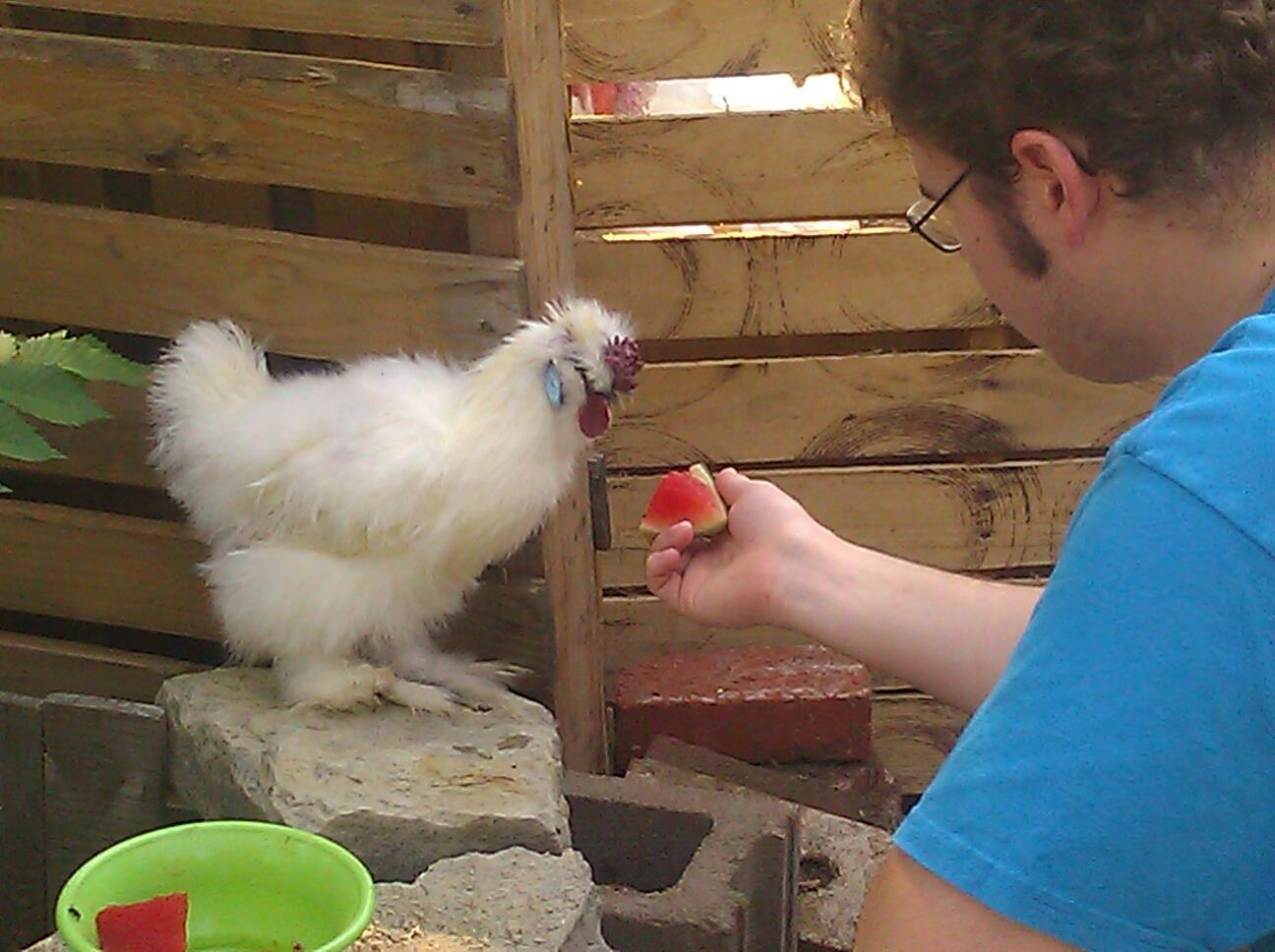 Noooooo, my silkie is NOT spoiled at all. Here's my son hand feeding him watermelon.