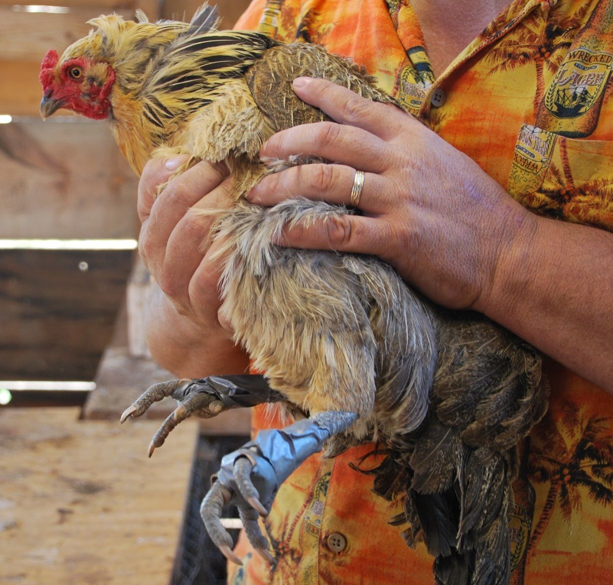 We have a hen w/ two bumble feet we have been treating, one was from a cut the other a thorn (I know b/c I got the thorn out.) Anyway here she is rocking her cool duct tape shoes