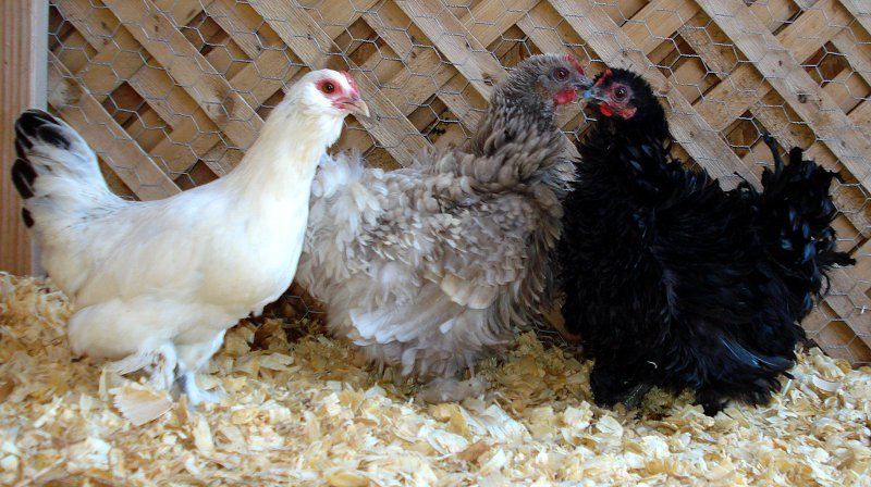 Here's the 3 I got yesterday. Does anyone know if there's a name for the color of the fawn colored frizzle? I've never really seen that color before on a Cochin, it's like coffee with cream. The white one is an Ameraucana/Cochin mix or D'Uccle mix or something, darling little girl.