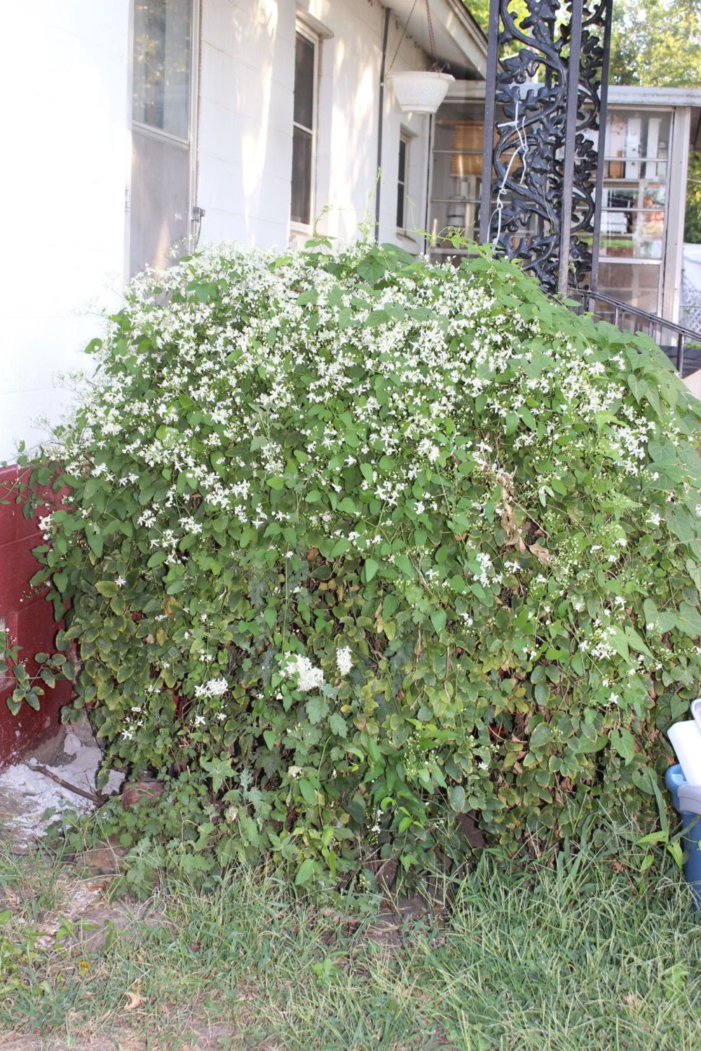 OK my vine finally bloomed- plant experts any guesses? I incorrectly self-identified it as Mile-A-Minute vine, but that doesn't usually grow this far north and it has a barb below each leaf which is absent in my plant. This thing does seem to pop up from blown seeds but I have not found it to be difficult to eliminate or invasive. It is a VERY vigorous grower- I cut this thing all the way down to the ground the year before. If I let it, it will grow up the porch support all the way to the house roof. Currently it is supported on a trellis next to the porch but I have to constantly remove tendrils from the ironwork on the porch. IT SMELLS HEAVENLY when it blooms!