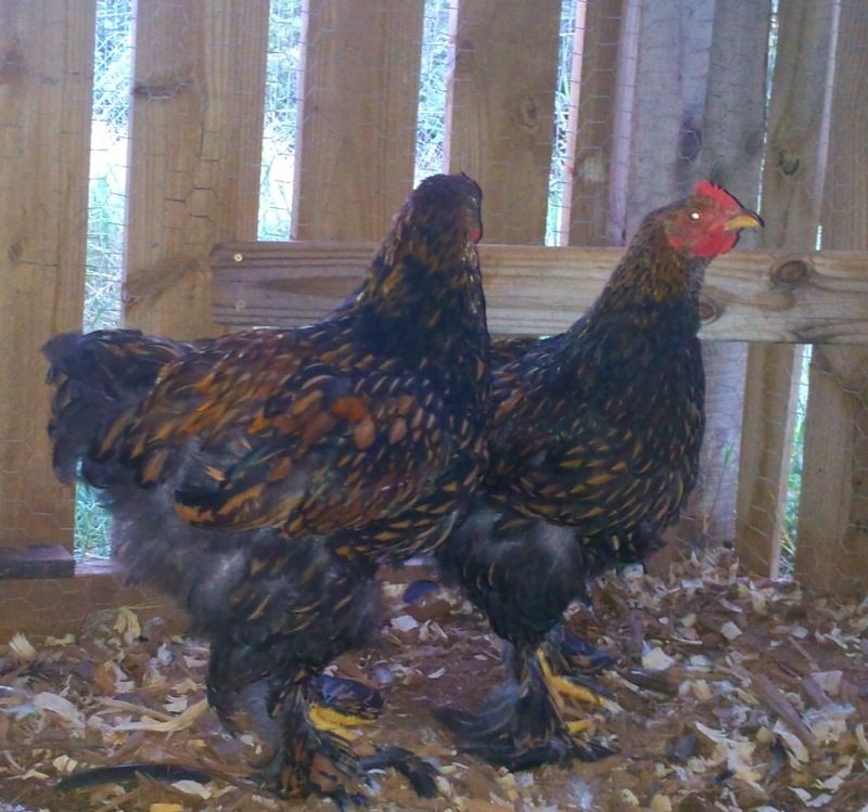Here's some pics of my 2 new Gold Laced Cochin boys. They're still babies, just have little combs. They're certainly sweethearts though. I put them in the 10x10 roofed pen with the Dove pair and 2 Pigeons & moved the 3 chickens from there to another area. I'm hoping they'll get along and I'll add girls in a few months. I'm such a SUCKER for roosters.