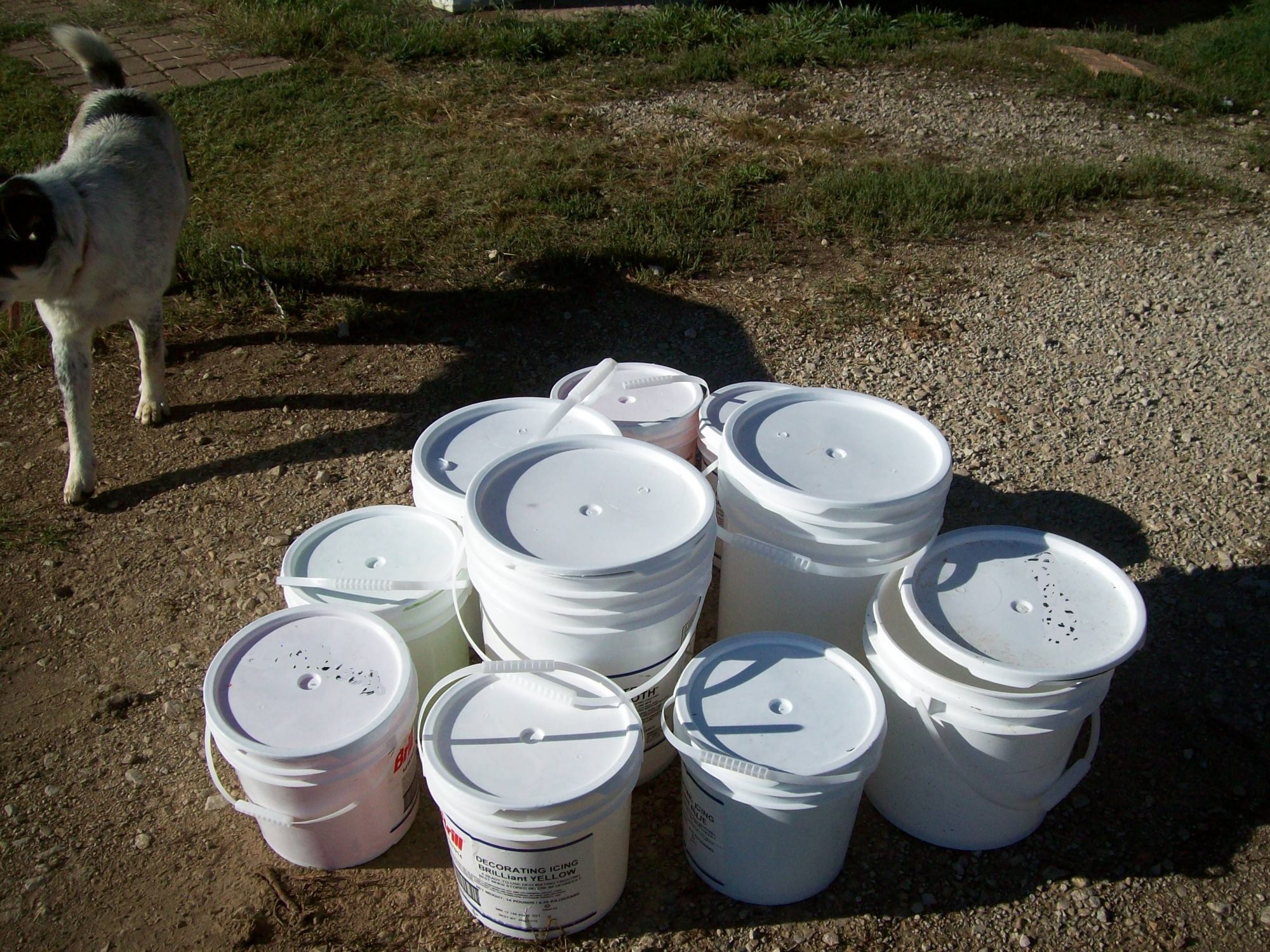 I use the same bucket, since I use such a big one. Just for ease the way we do it is when we get down to about a 5 gall bucket amount of grain in the barrel we take the grain and 1/2 the liquid and put them in a 5 gall bucket then refill the barrel w/ grain fresh water and 1/2 the original liquid that was left. We do this so we can continue to feed out the fermented grains for a few days until the new grains have enough time to set up a good ferment. Any liquid still left in the 5 gal bucket we just re add to the barrel as we use the grain for those few days. You could just dump the new grains and water in the original container, but then you are feeding out barely soaked and unfermented grain for a few days, and trust me once they are used to the fermented stuff they will seriously turn their beaks up to the unfermented stuff.