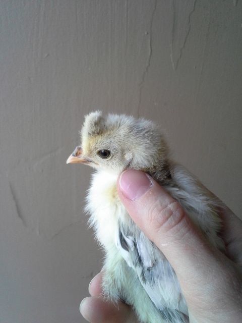 So cute! Is that a bowtie? Showgirl?One of my two month old silkie chicks - same age as KSane's. He/She is an orange frosted blue. It was the light blue chick striped with tan. The egg was marked from the blue/splash pen. Just love silkie color schemes!![]()