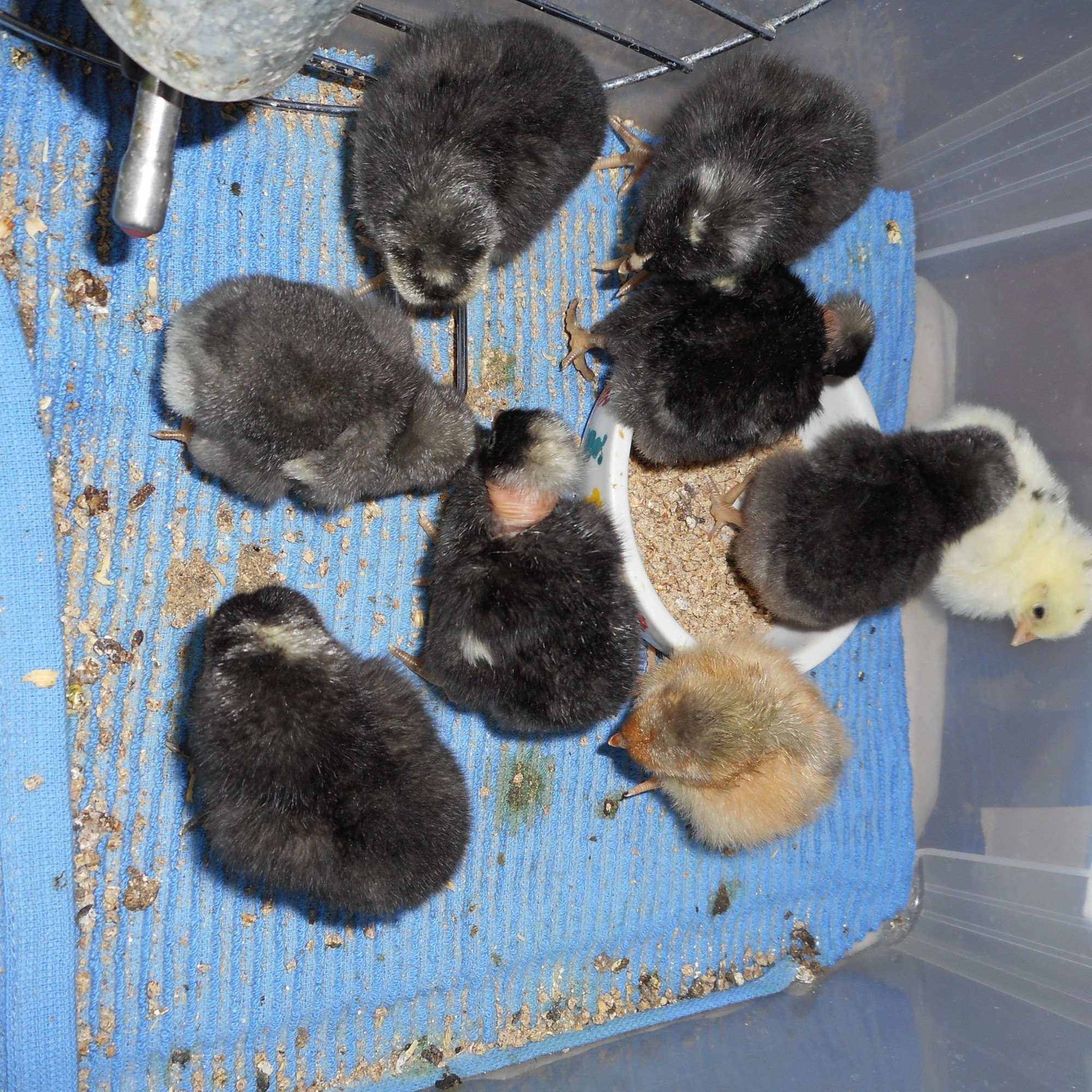 Best hatch ever! Out of 11 eggs that made it into lockdown - 9 hatched!!!! And one of the two wasput in 2 days later, so it has a few more days to go before it is declared nonhatched. Never in my wildest dreams did I think I would have so good a hatch! Two naked necks that look to be sired by the barred rock roos, couple of barred rock and barred rock mixes - the grey is likely a sex linked barred rock egg that did NOT get the barred rock gene, so I need to read up on which sex does. Then the brown one probably a blrw, the white - no idea whatsoever - these were all light colored eggs - I have the br and blrw and naked necks. The white's eggs looked closest to the nn eggs - though I have one or two birds that might lay similar eggs- no silkie feet or skin coloring - so not a silkie paint (besides, I'd recognize the egg.)