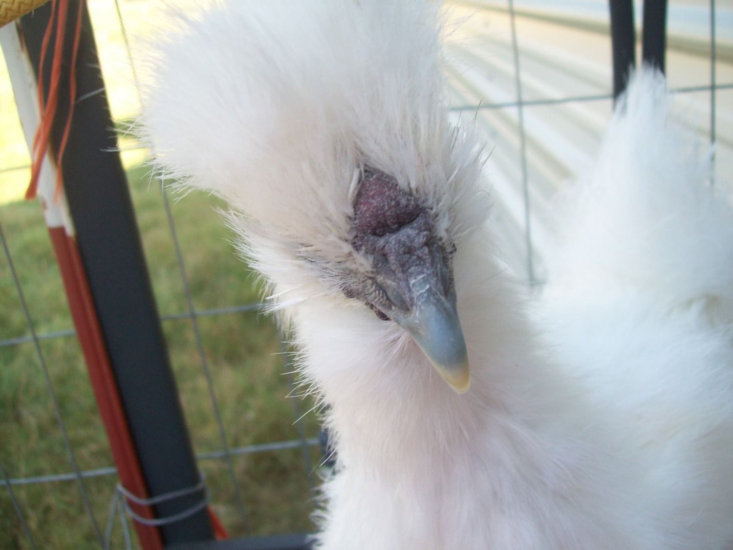 it stays that way! Super lucky!@ashtree It's huge whatever it is! It almost covers his other eye! She said she showed a white and him together and they won first place. I haven't had time to look him over until this morning while I was taking these pics. So disappointing. Oh well, I will know for next time! What do you think of the white ones? They have a few more regular feathers in the wings and tail. Is that normal?
