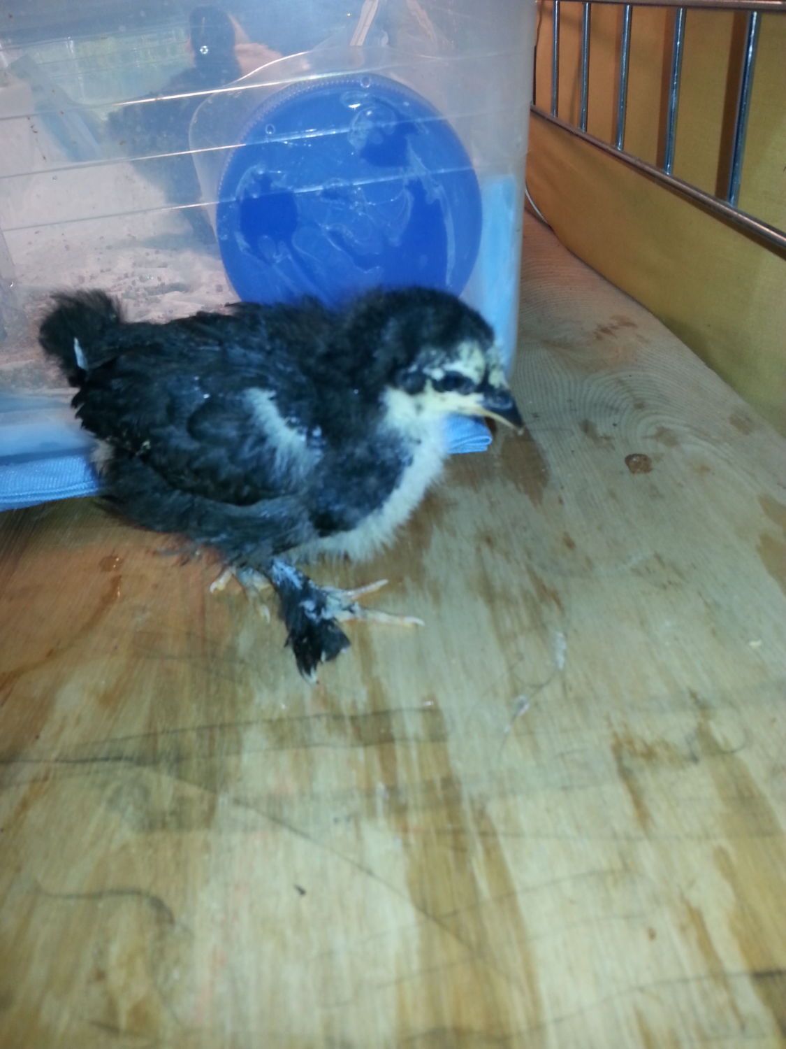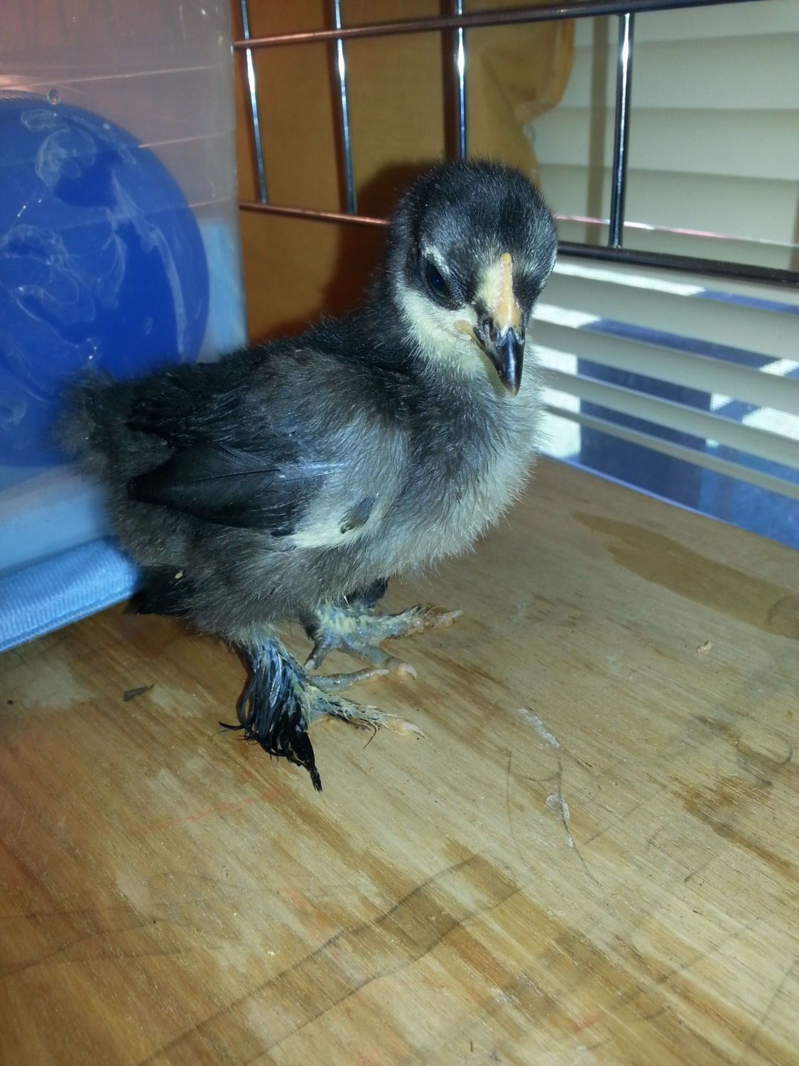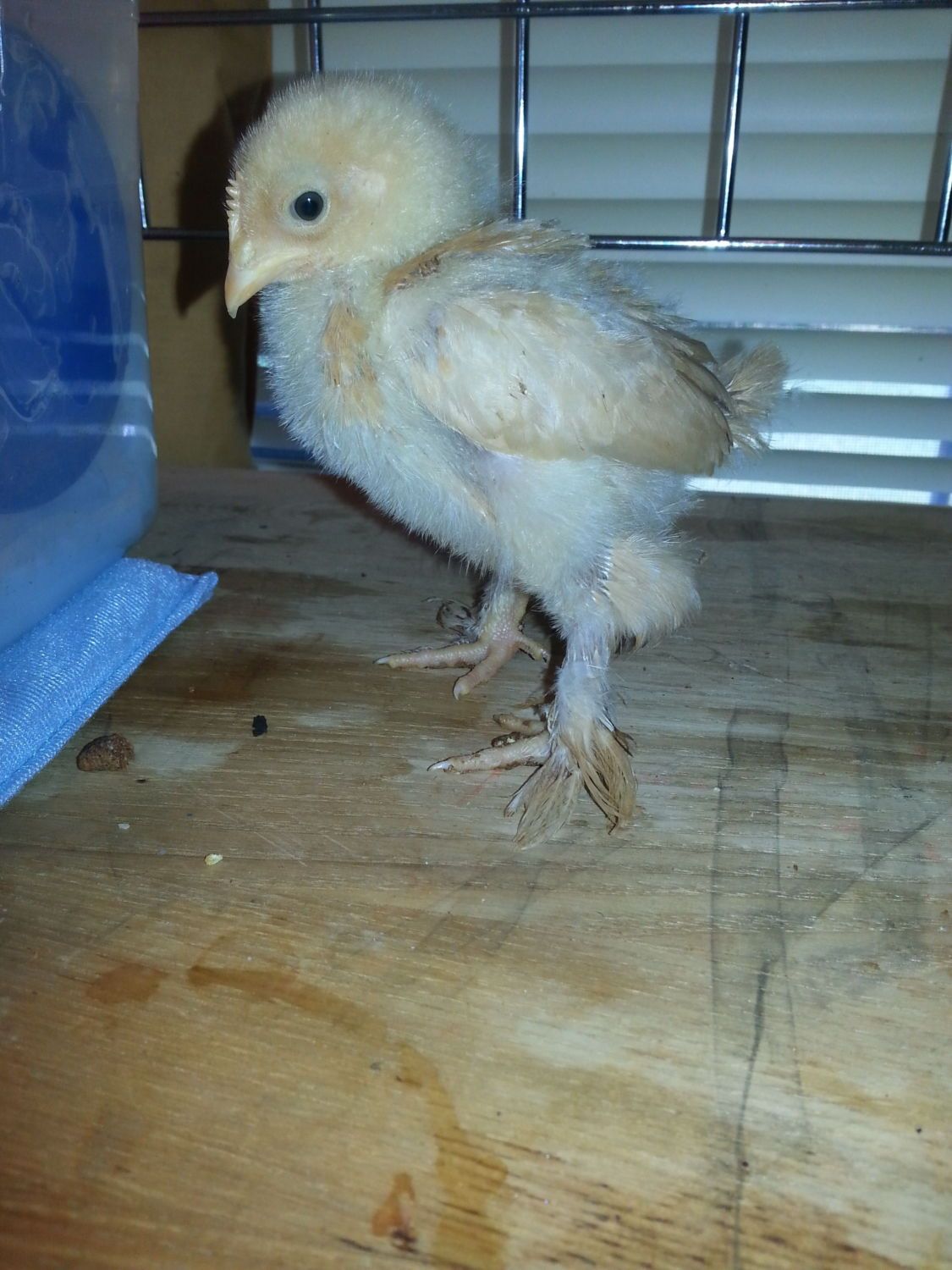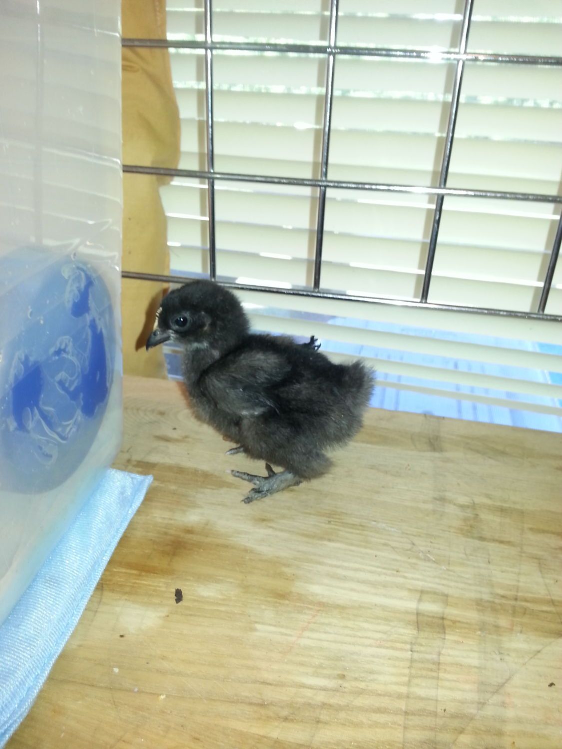 There are two for sure roosters, and two more maybes. The second black one and the first yellow. I hope I'm wrong. The yellows may actually turn out to be porcelain duccles! I say that because of the feather tuft on the hock on the male. They are feather legged like cochins, and a frequent option in feedstore bantam bins. The curly feathered chick is probably a frizzle cochin roo.![]()