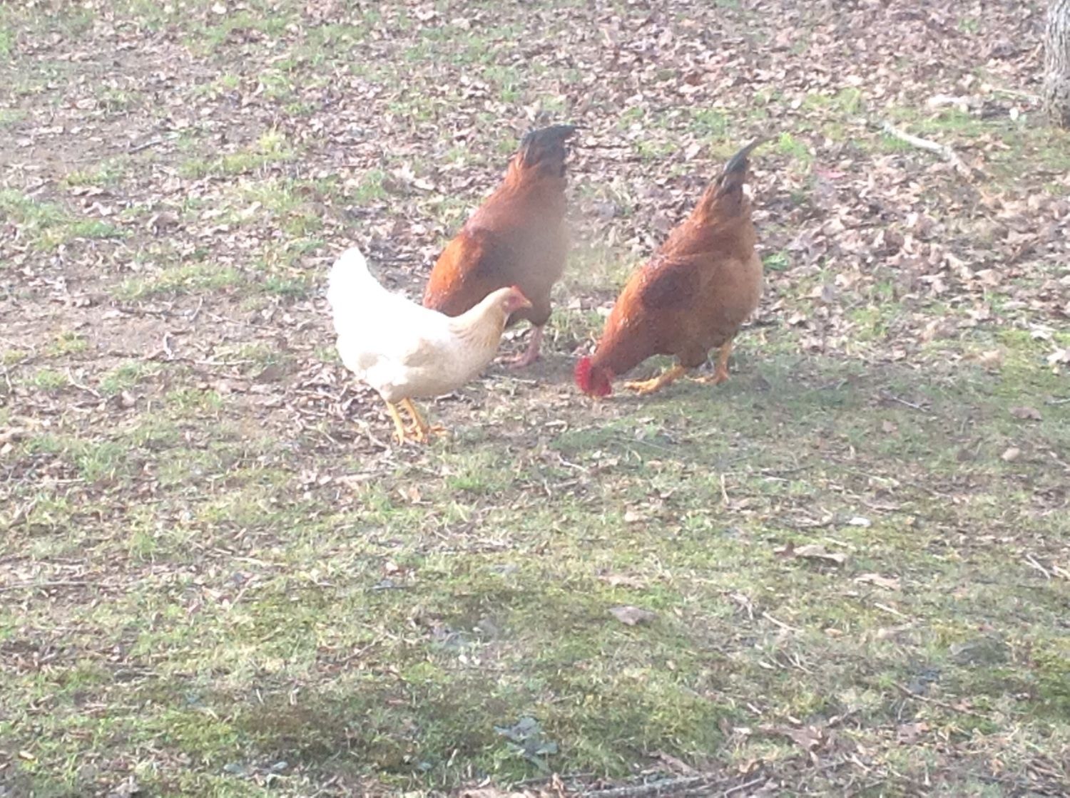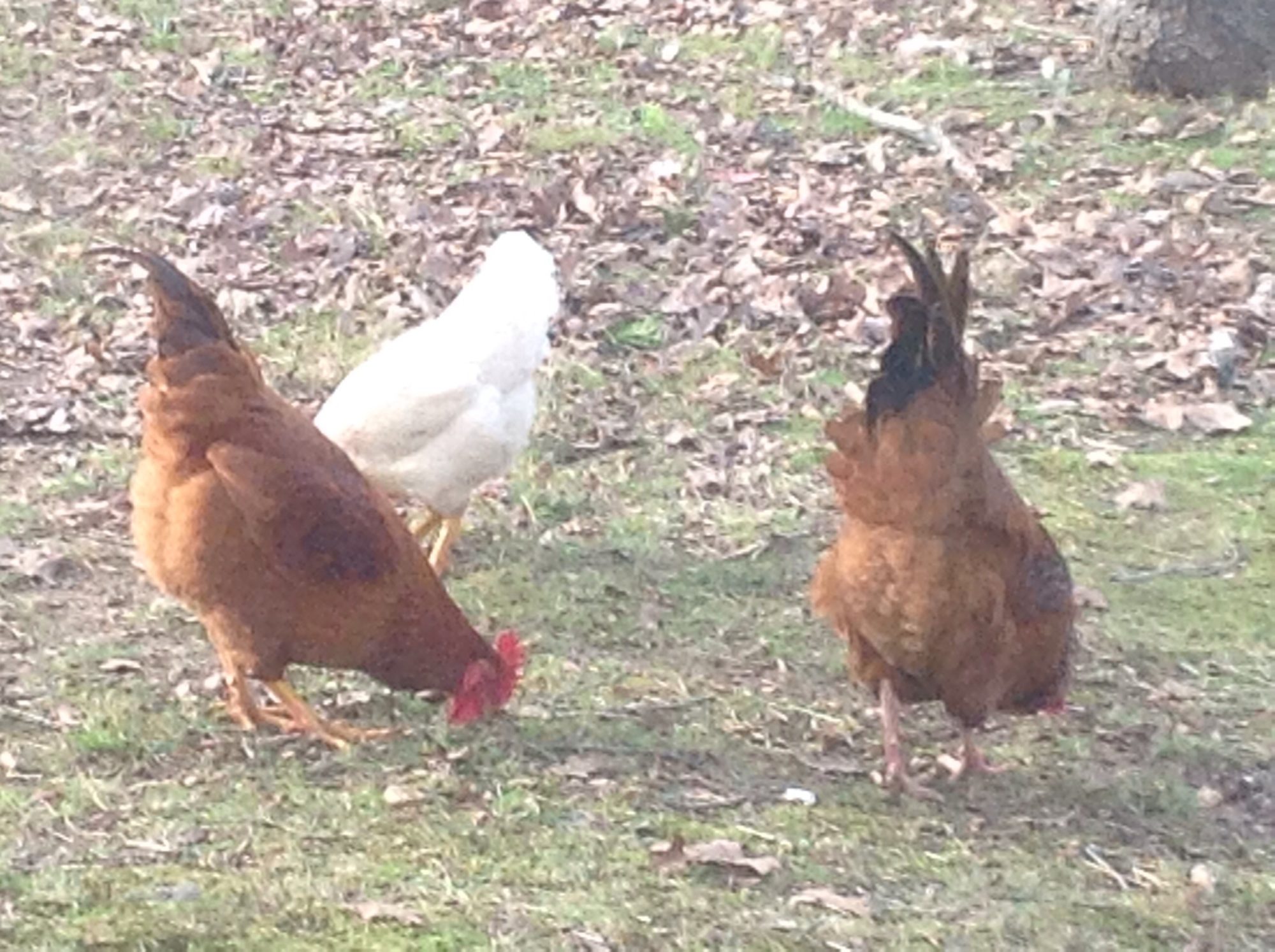 The three would be best described thusly. 2, are copper red colored. Like a bright, shiny copper penny, is the best my color blind eyes can see them as. These two appear to be nearly identical twins. Beautiful, prominent straight combs, LONG wattles, two long, curved, tail feathers, and have not yet begun to sprout spurs. EVERYTHING about them, screams "Rooster". With a couple of exceptions. They both have big, fluffy rumps, like a hen, and my roosters are not only not acting like these are "competition", all 3 of my roos, have at one time or another, tried to "mount" one, or the other. Both of these visitors act like hens, but look like roos. Capons, maybe? If so, why do none of the neighbors want to lay claim to them? I'd think, that if someone were to go to the bother of caponizing them, that they'd want to keep them in their flock. They might be a little skittish, but they both seem very docile and sweet.
