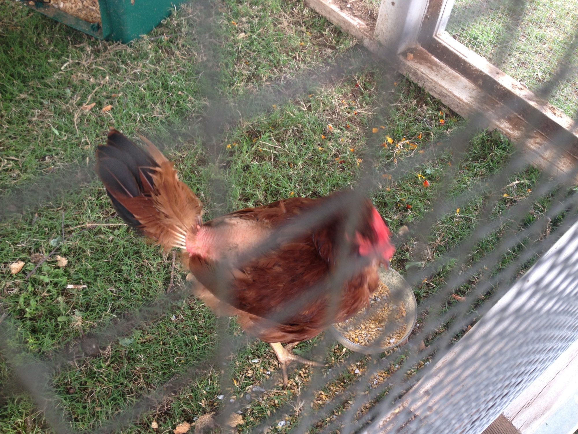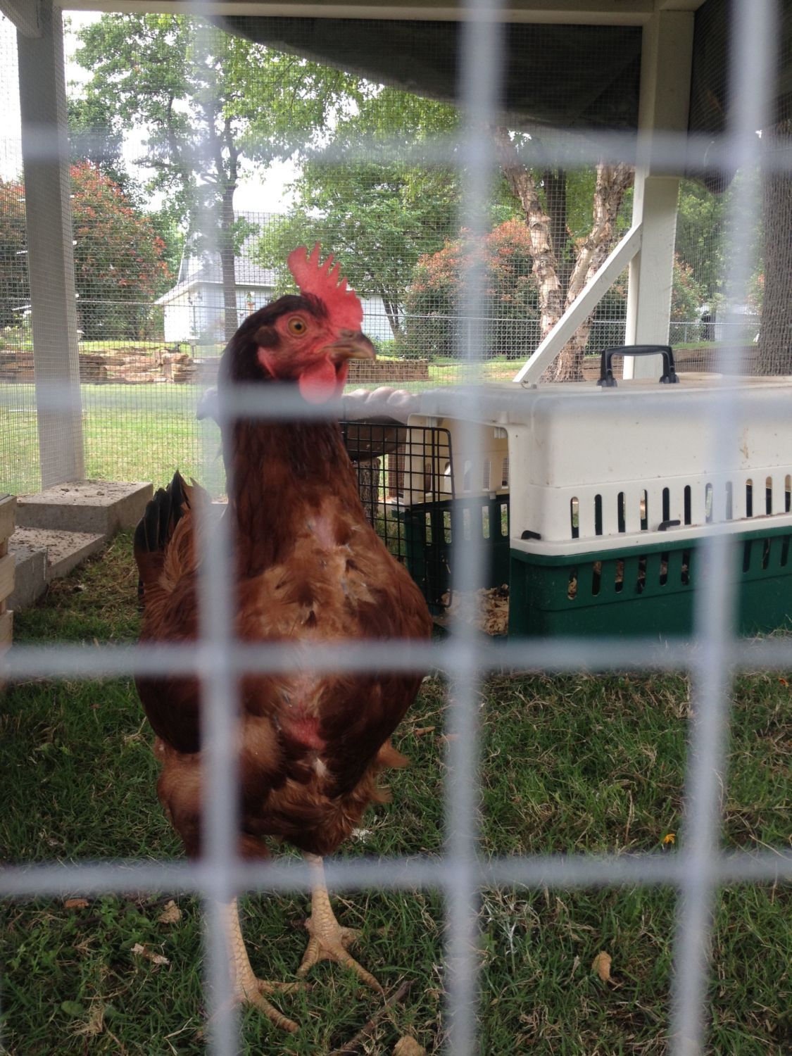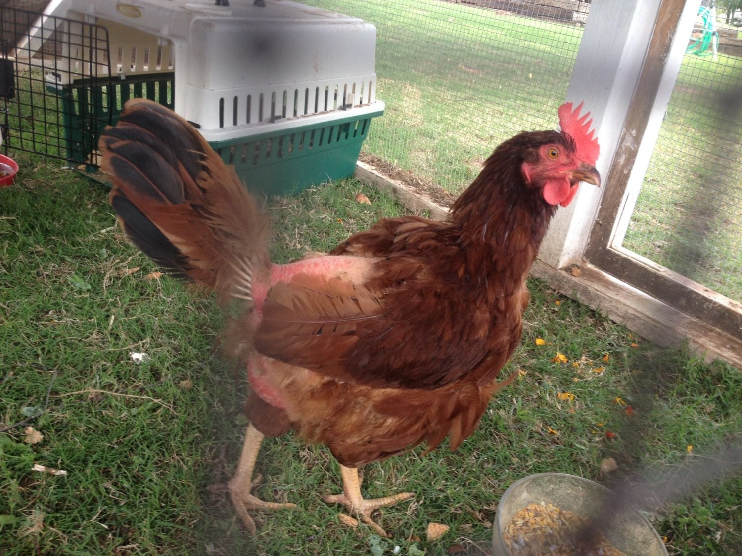 5/14/16 Six days have passed and feathers are sporadically re-growing. Sectioned off a portion of the run so she has more room and some "comforts of home".