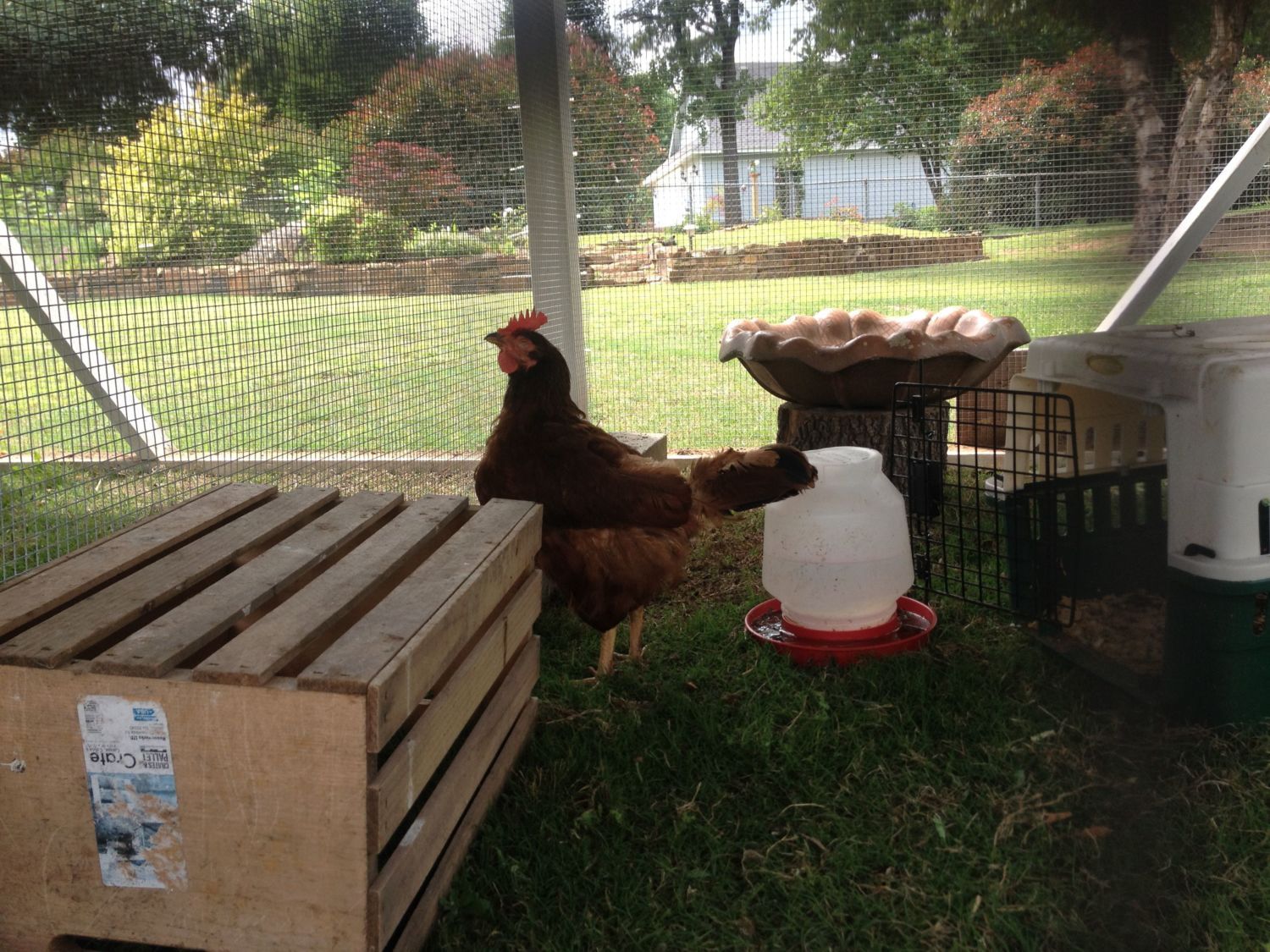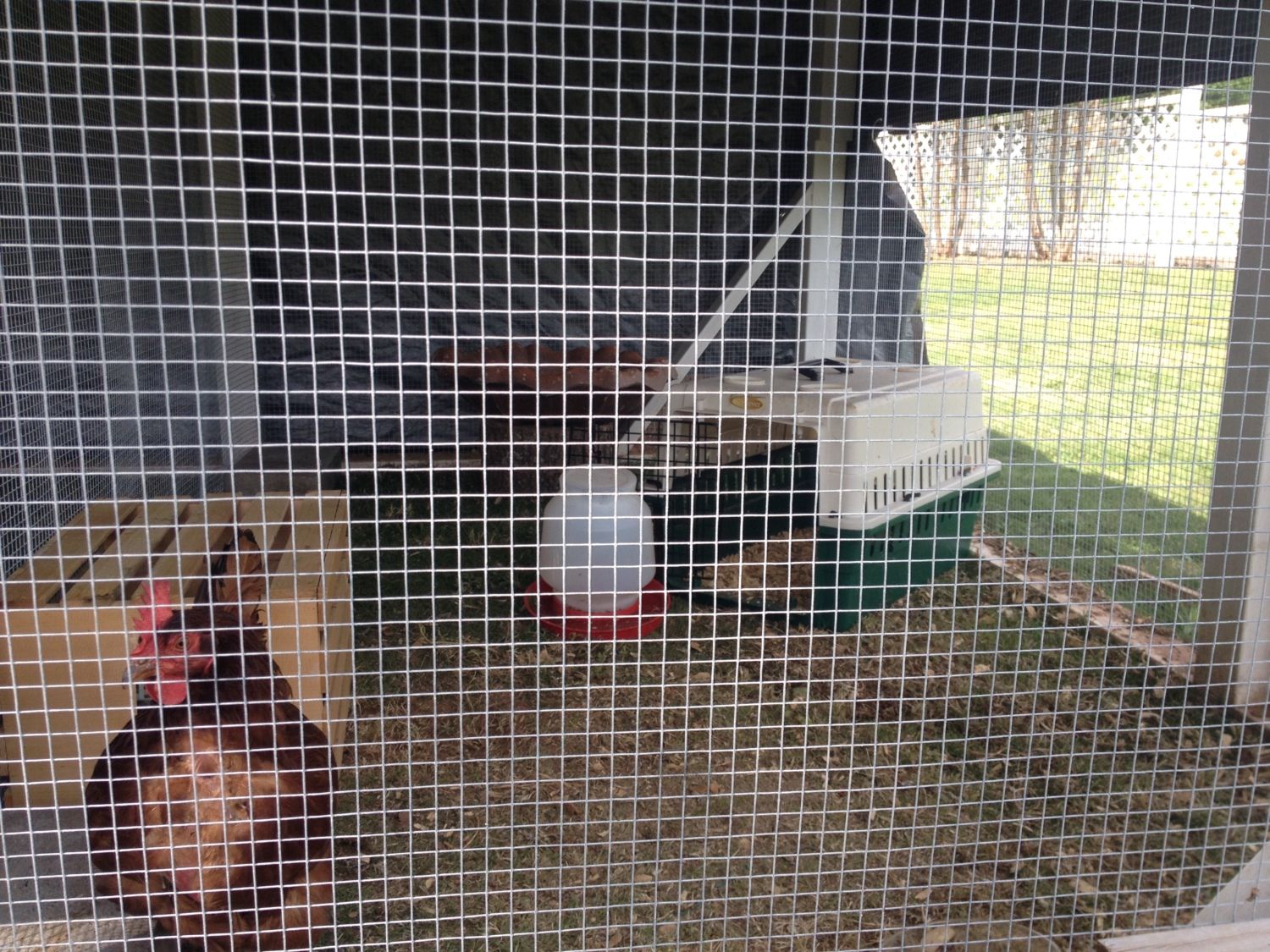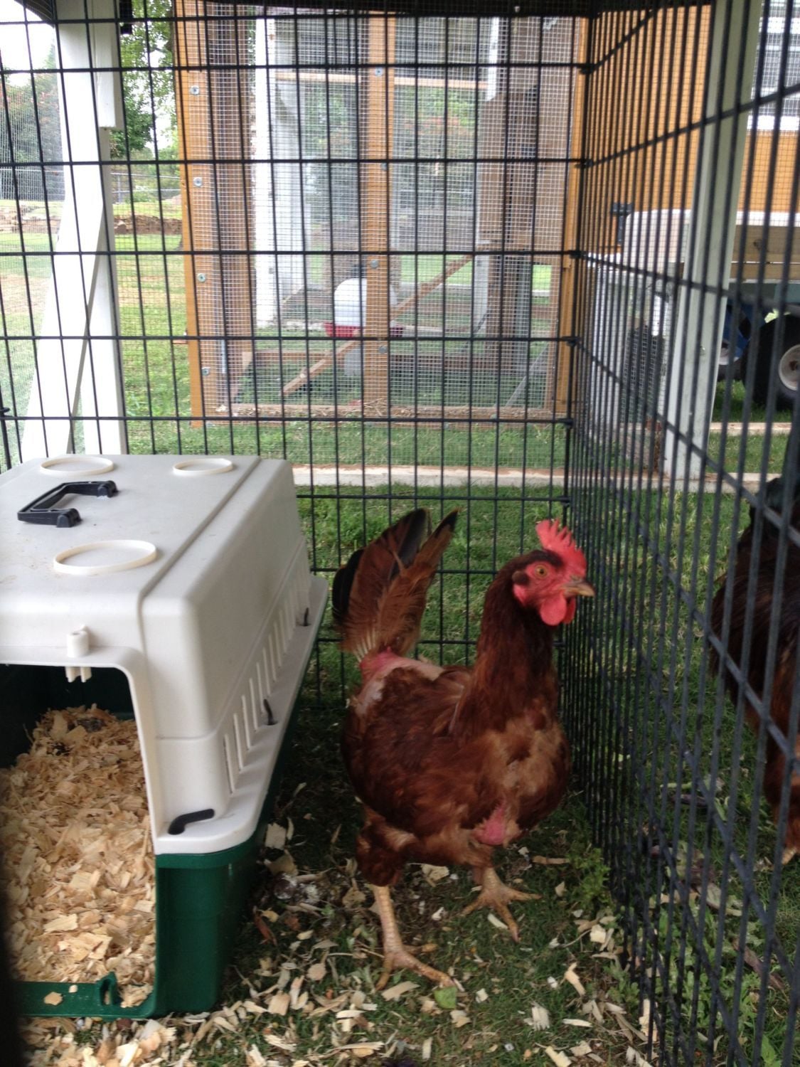 5/14/16 Six days have passed and feathers are sporadically re-growing. Sectioned off a portion of the run so she has more room and some "comforts of home".